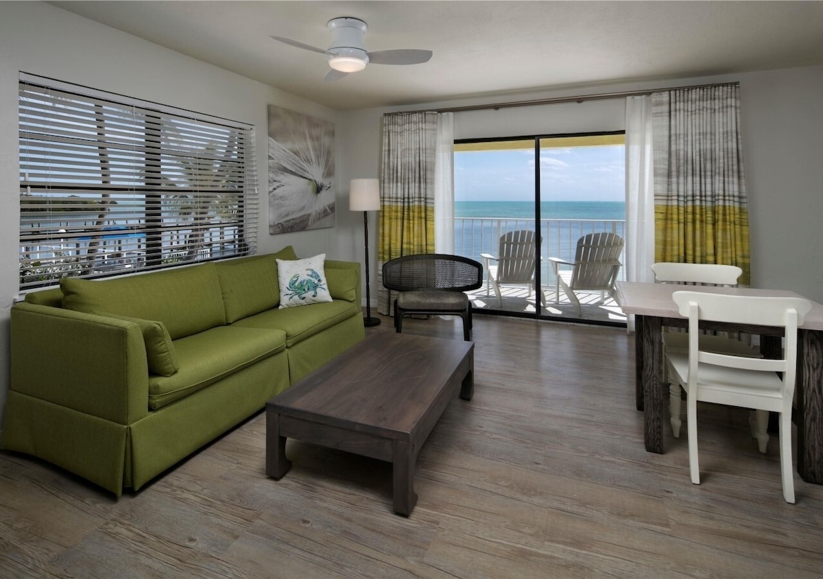 Find space to relax and recharge in our Junior Suite in Coconut Wing, featuring a private bedroom with a king bed and a separate living area with a sofa bed. Whether you're returning from a day of kayaking, snorkeling, or beachside lounging, this suite offers the comfort and convenience you need—with a small refrigerator, daily housekeeping, and all essentials provided. It’s a welcoming retreat in the heart of our lively bayside property.