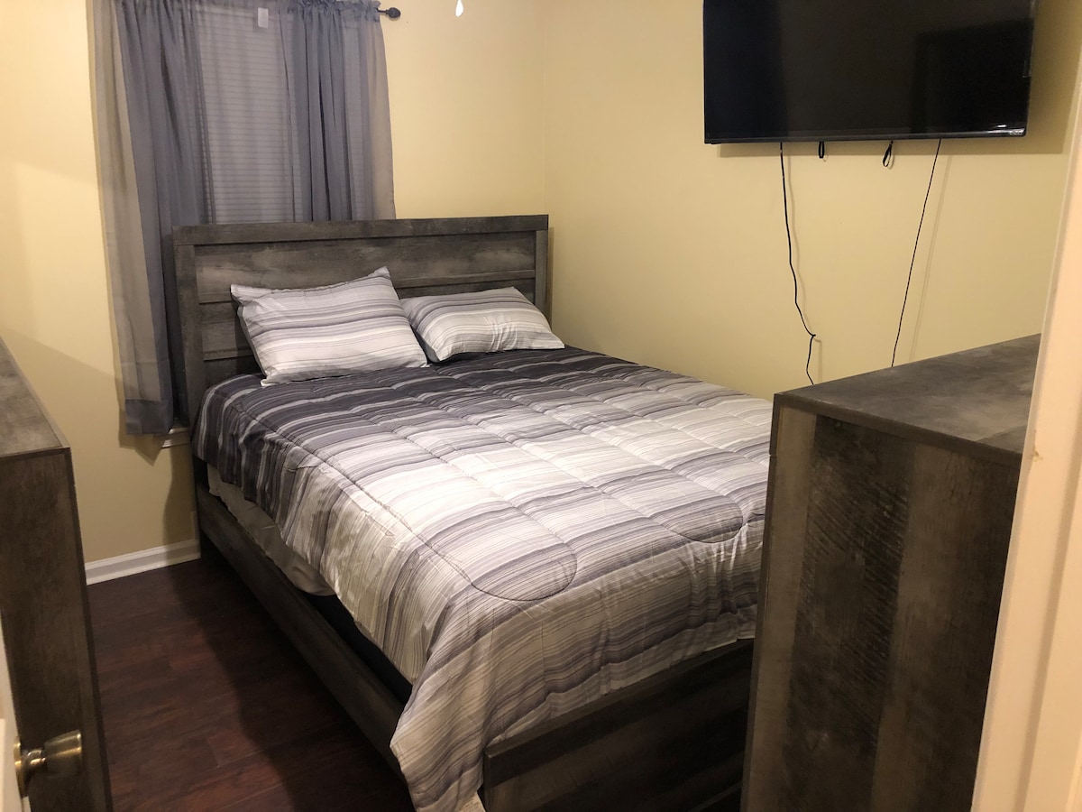 Apartamento estudio privado con estacionamiento/entrada independiente en un barrio tranquilo. Ubicado en el centro de tiendas, restaurantes y parques. Aeropuerto: 12 min CNU: 6 min Centro médico Riverside: 7 minutos Hospital Sentara: 8 minutos Langley AFB: 11 min Centro comercial Patrick Henry: 8 minutos Willimasburg/Bush Gardens: aprox. 30 minutos Virgina Beach Oceanfront: 45 minutos Wifi disponible con TV de 55 pulgadas con servicios de streaming (sin cable). La mesa de centro se convierte en una mesa de comedor/trabajo. Taburetes debajo de la mesa. Baño completo/cocina/lavandería.