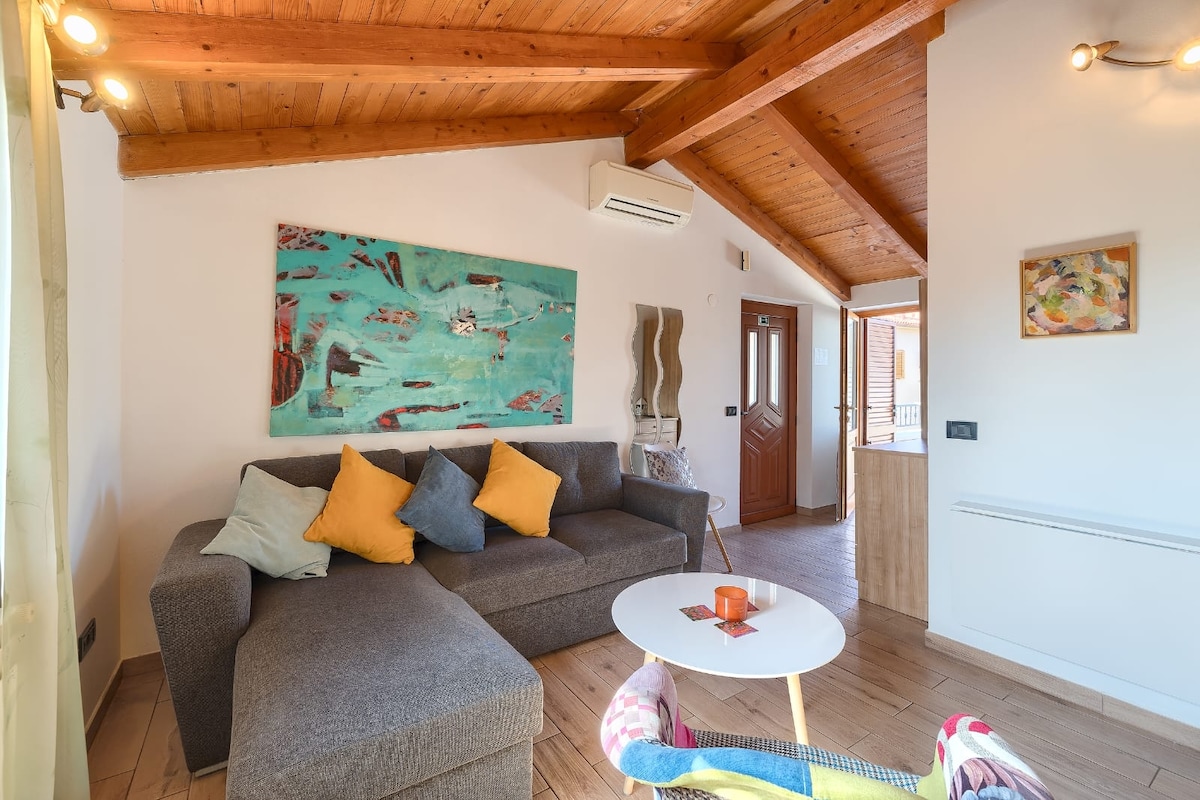 The apartment is located on the first floor of a family house in a very quiet neighborhood. It consists of a bedroom with a large double bed, a fully equipped kitchen, a living room with a sofa, a bathroom with a shower. The terrace is private, large, comfortable and partially covered. Parking is in the yard, free of charge. Apartment is only 15 minutes walk from the beach, 5 minutes drive to the cultural and historical city of Rovinj.