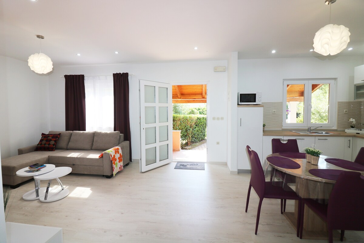 Studio apartman od 30-ak m2, sastoji se od spavaće dijela sa bračnim krevetom, kupaonice sa tuš kabinom te kuhinje i blagovaone te dnevnog boravka sa kaučem na razvlačenje i možemo ugostiti 3 osobe. Apartman je zapravo jednim stranom spojena kućica, nalazi se u prizemlju, na zemljištu veličine 3 300 m2
