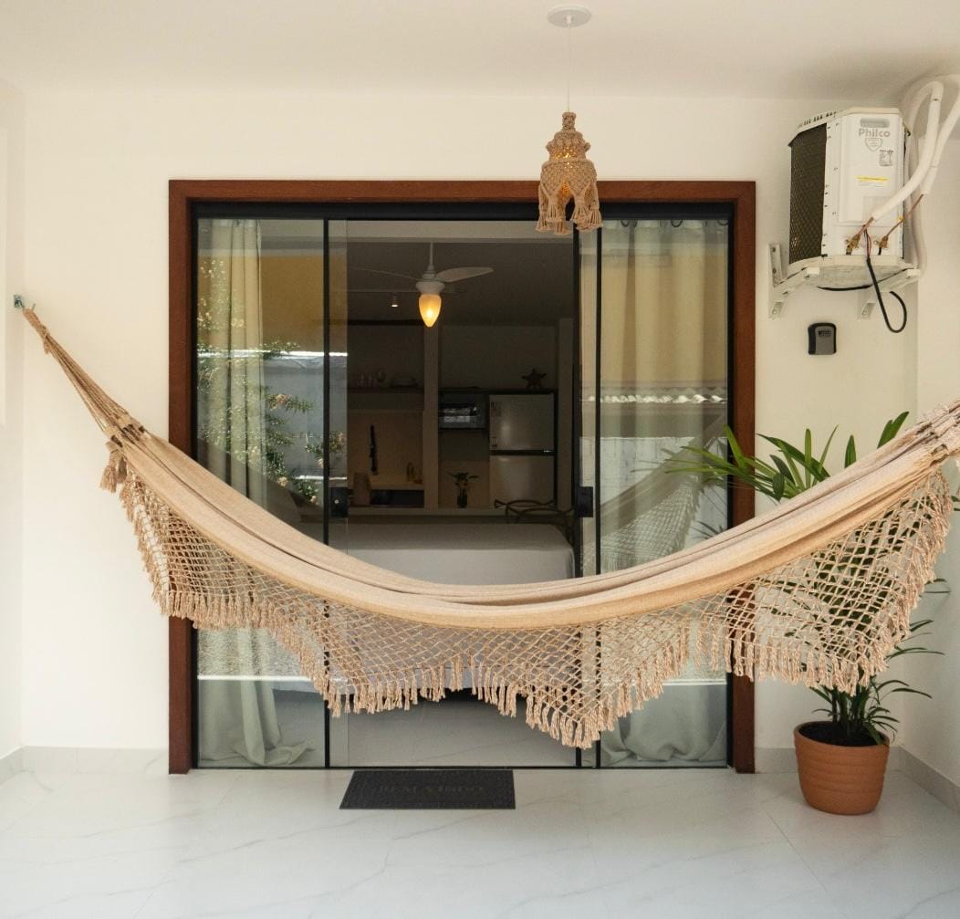 Estratégicamente ubicado en una zona rodeada de bosque, pero en el centro de Itacaré, el apartamento es un espacio compacto (35 m²) pero completo para viajeros en estancias cortas y largas. Cuenta con mesa de trabajo, despensa, cama tamaño queen, aire acondicionado, Smart TV 43'' con streaming, baño privado y balcón con hamaca. (ver más detalles a continuación) Nomads Flats ofrece dos tipos de alojamiento para que disfrutes de Itacaré. Este anuncio se refiere al apartamento ubicado en la planta baja (sin jacuzzi).