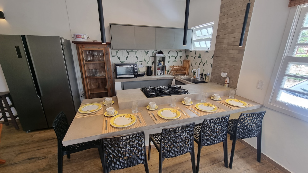 Casa con estilo y comodidad , suite de 5 estrellas (ducha de gas y bañera grande para dos con agua, aire acondicionado, ventilador de techo, colcha queen de calidad, sábanas de algodón de 400 hilos,TV, WiFi rápido: dos proveedores, balcón con red, vista al bosque atlántica y amplio armario. Para tu comodidad adicional: chimenea, cocina completa y quiosco-churrasqueira, piscina para dos sauna y río, todo privado. Jardín vallado para tu mascota. Condominio tranquilo, fácil acceso a las playas.