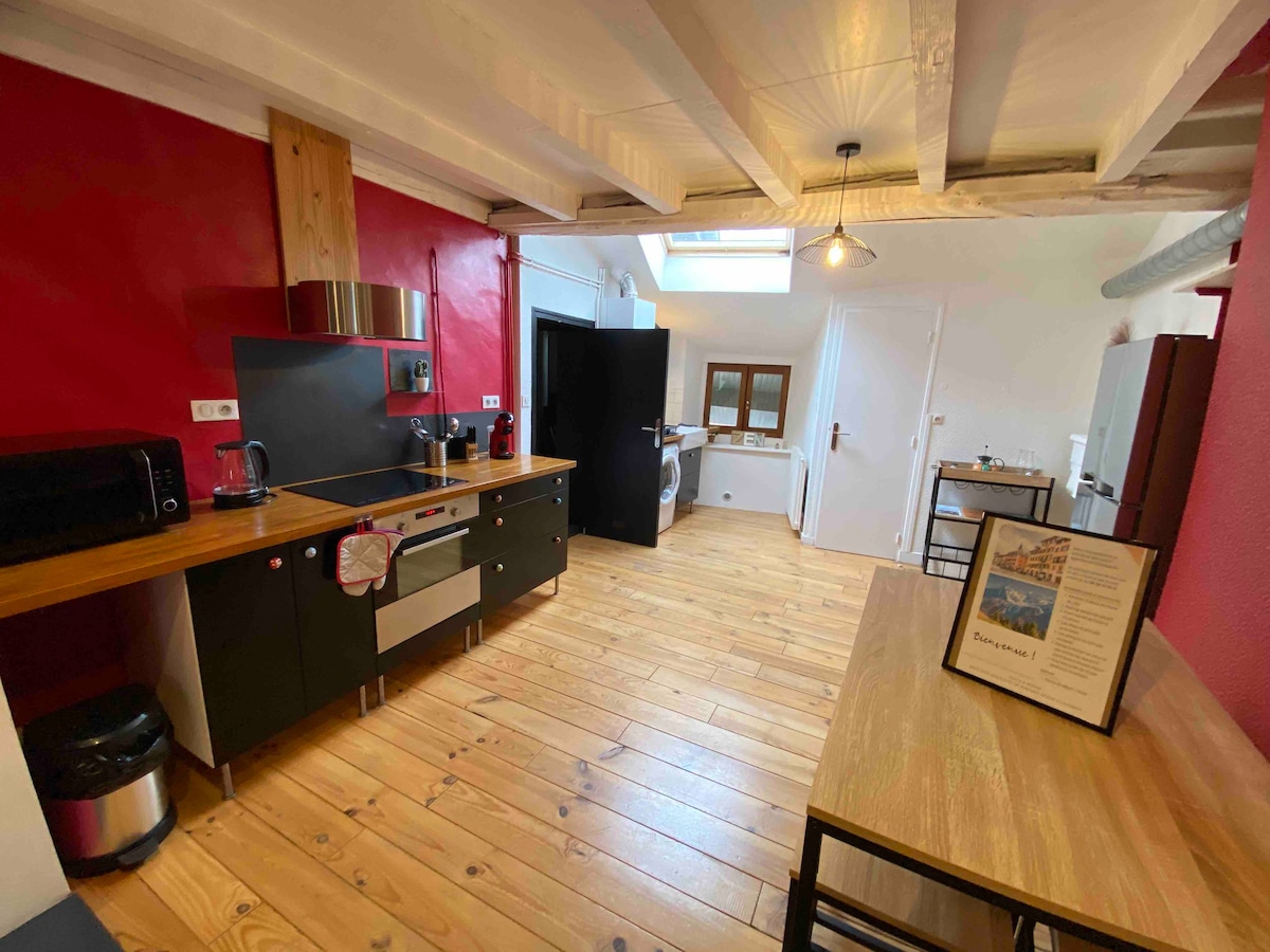 Con una ubicación ideal en el corazón del centro histórico de Chambéry y tranquilo en una calle del siglo XIV, nuestro apartamento tiene todo el encanto de lo antiguo con las comodidades modernas. Una gran habitación con una cama doble, un altillo con cama (a los niños les encanta) y un sofá cama en la sala de estar con capacidad para 4 personas. Todo está cerca y accesible a pie (estación de tren, autobús, restaurantes, tiendas, monumentos, etc.) Wifi gratuito y parking en los alrededores