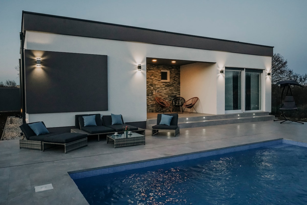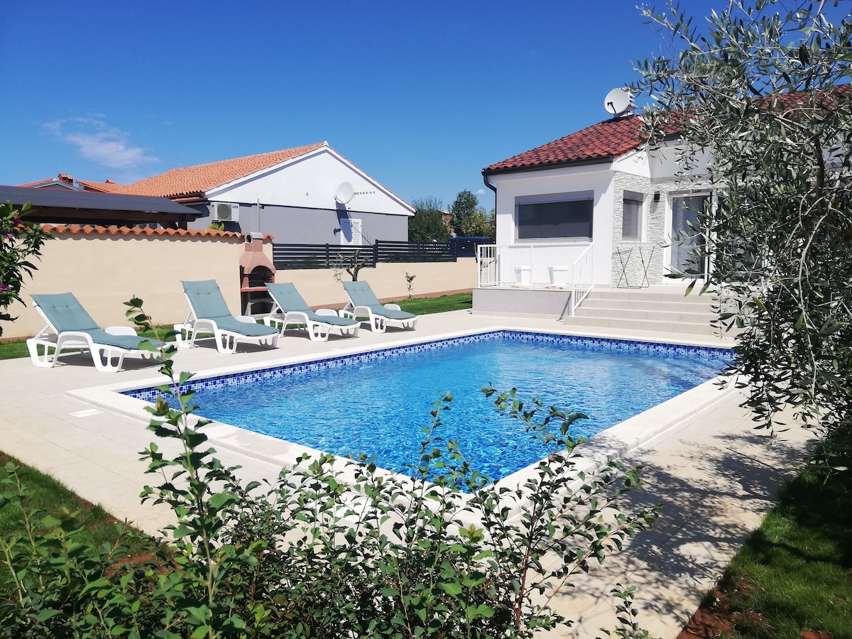 A brand new city villa with a swimming pool designed for your maximum comfort and pleasure.The location of the villa is the perfect combination of the tranquility of a countryside and the proximity of the center of the 3000 years old city of Pula.The house can accomodate 6-8 people and it consists of a ground floor with the kitchen and dining area with direct access to the outdoor terrace and the swimming pool,living room and bathroom, and the upper floor with 3 bedrooms each with its own bath.