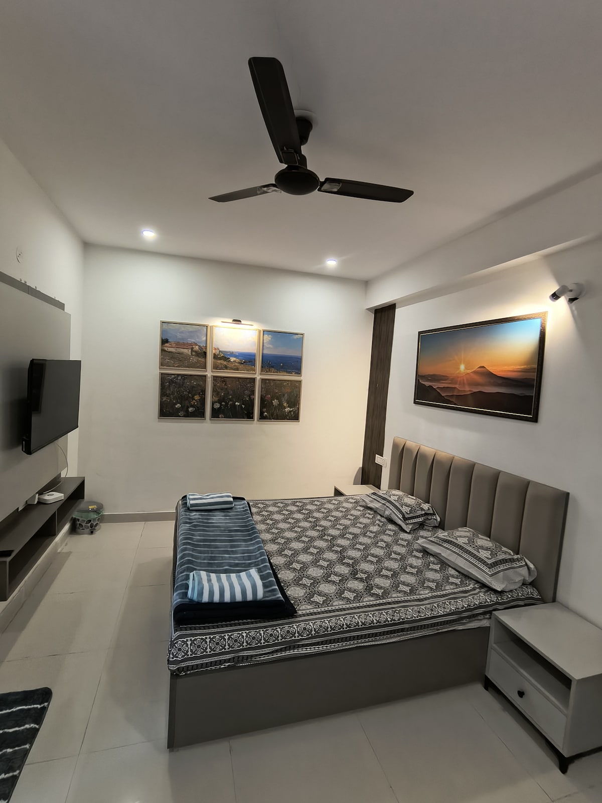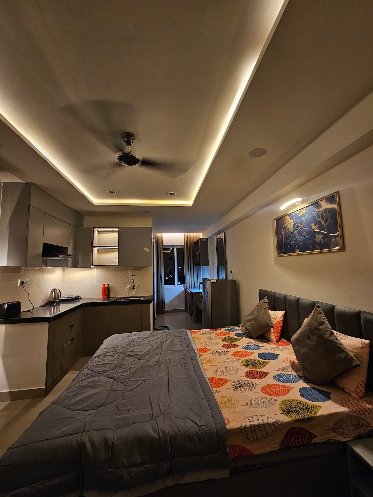 Enjoy a comfortable and stylish stay in this modern, spacious 1BHK luxury apartment, thoughtfully designed to accommodate up to 4 guests. A comfortable king-size bed, while the living area includes a king-size sofa cum bed, making it ideal for families, couples, or small groups. The apartment offers two premium bathrooms, ensuring convenience and privacy. A fully equipped kitchen allows you to cook with ease and step outside to the peaceful outdoor sitting area, perfect for morning tea .
