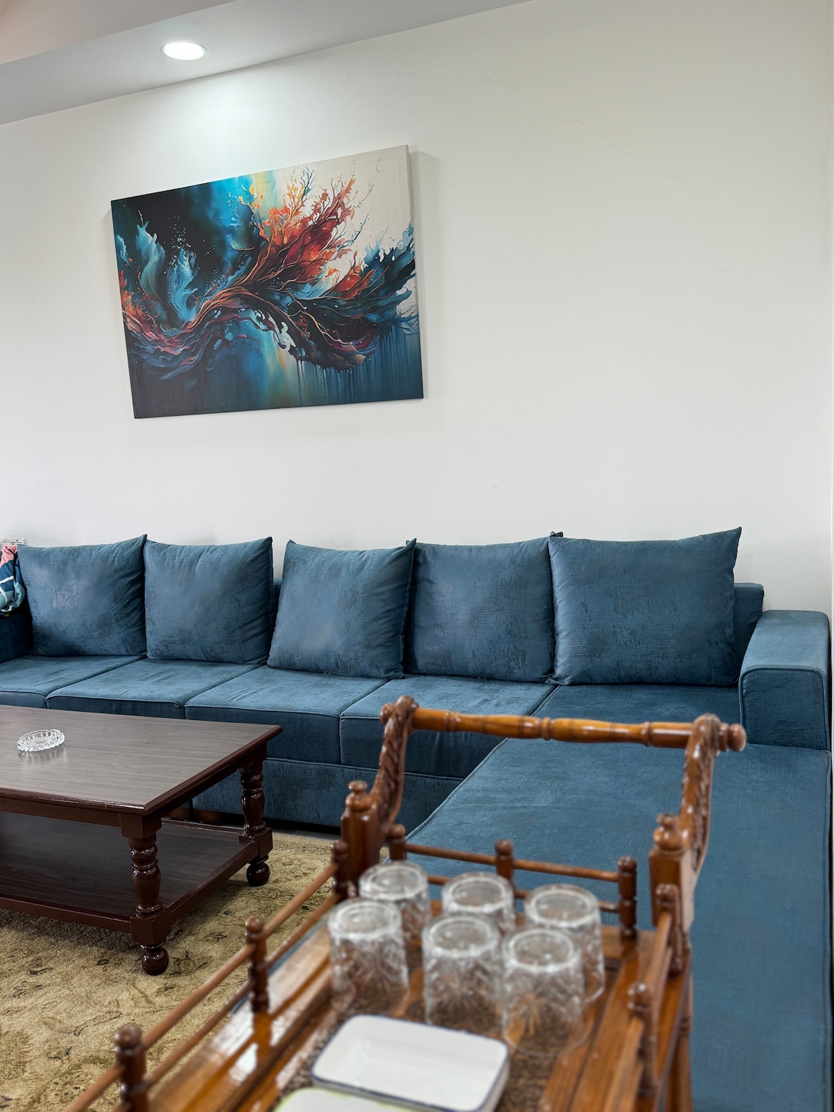Este lugar tranquilo y sereno es artístico y elegante, con plantas, esculturas, pinturas, antigüedades e interiores de diseño creativo. Diseñado por el artista Tarpan Patel, está situado en el centro, cerca de lugares de interés, restaurantes populares, bares, arte y centros culturales. El apartamento está en la segunda planta sin acceso a ascensor. El aparcamiento está fuera del sitio, en la carretera principal. Puede estar a 1 o 2 minutos a pie. No se permiten visitas debido al COVID.