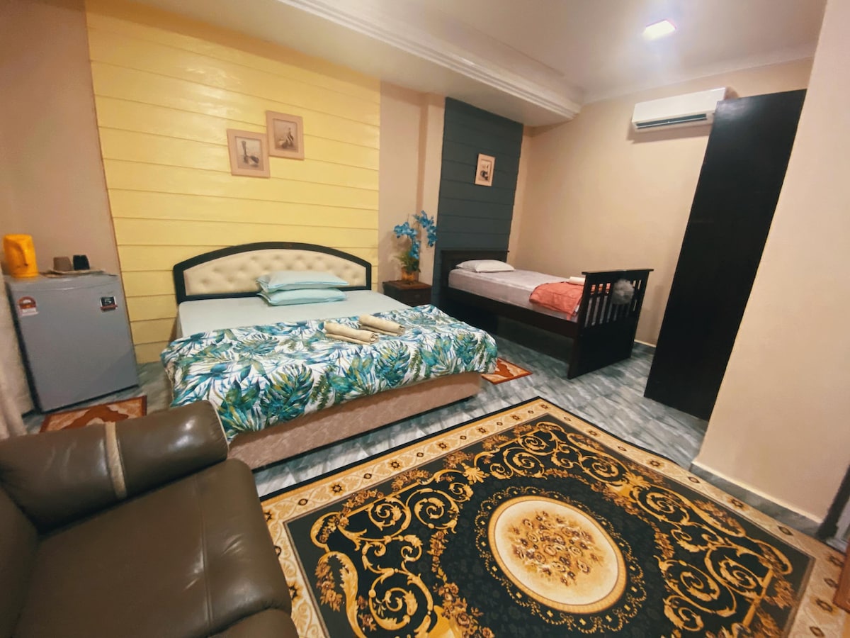 Keep it simple at this peaceful and centrally located studio, perfect for couples, small families, or a small group of friends. This cozy studio comfortably accommodates 2–5 guests, featuring one queen bed with a pull-out single, air conditioning, and free WiFi for a relaxing stay. Guests have access to the swimming pool 📍 Conveniently located in Besut, with easy access to nearby amenities and main attractions. ✨ Suitable for short stays, transit guests, and family-friendly trips.