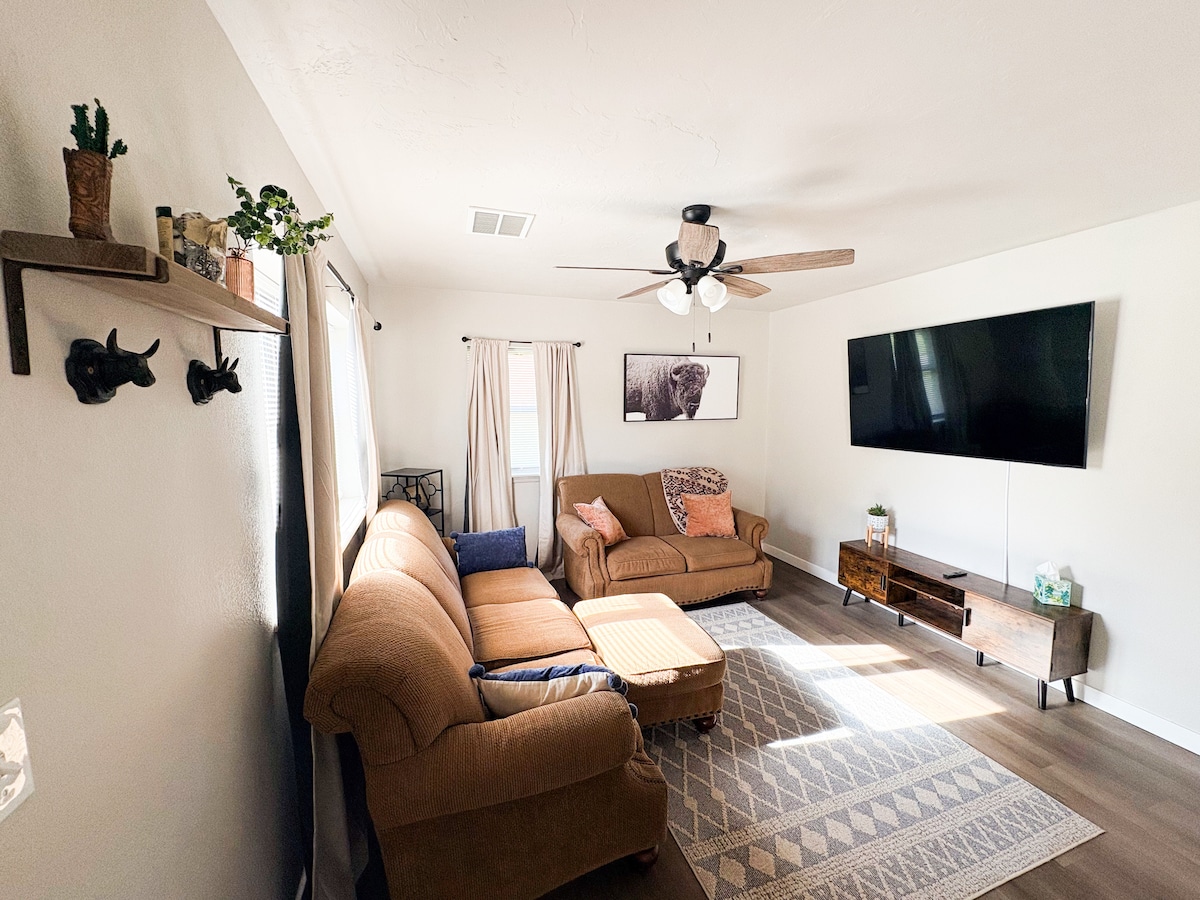 Discover your personal haven at "Prairie's End", a 40-acre property offering unparalleled serenity. Imagine waking up surrounded by nature and enjoying peaceful walks through the trails, watch the deer and multitude of wildlife. The open space provides a queen bed, a couch that converts to a bed, a double air mattress on frame found in the bathroom closet and a single roll-away bed. There is also an event center at the same location that is a communal space for guests or booked separately.