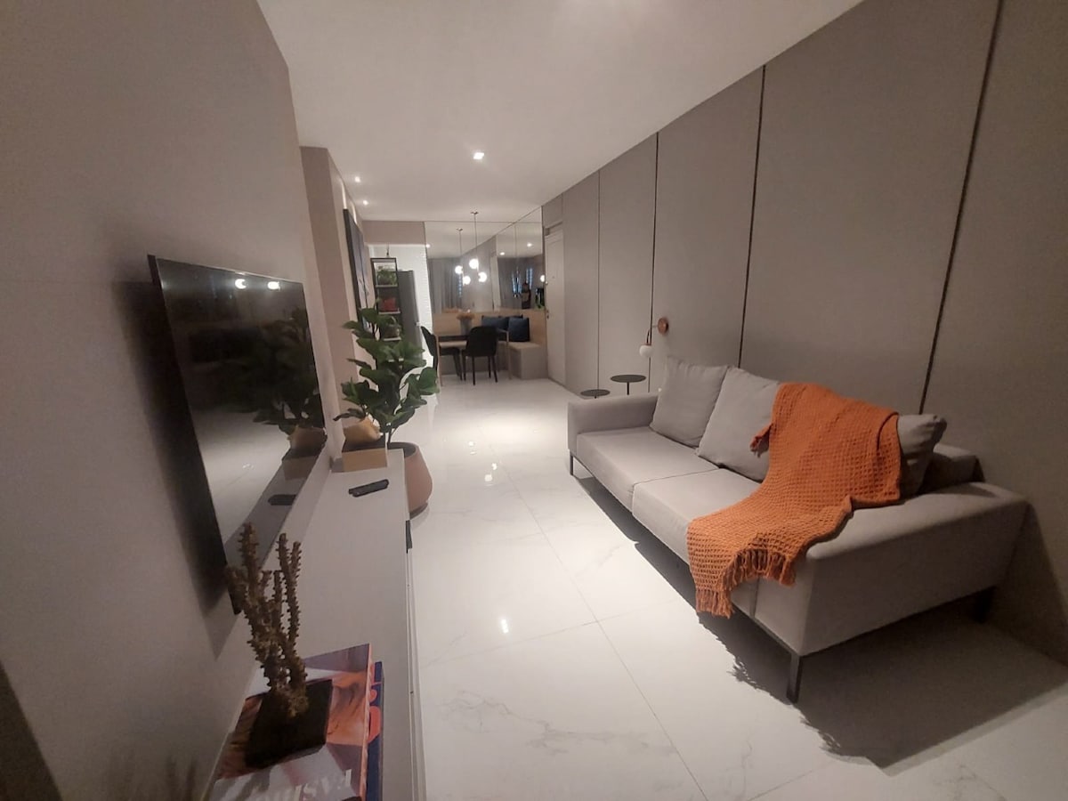 Estudio con una decoración cálida diseñado para estancias cortas o largas. Perfecto para parejas, personas que viajan solas por placer/trabajo o familias con un hijo. Estructura para hasta 3 personas, con cama doble y cama auxiliar, que acomoda cómodamente a un niño o adulto de hasta 75 kg. En una región centralizada con fácil acceso a los principales puntos turísticos de João Pessoa, el apartamento está a aproximadamente 1 km del mar en una calle tranquila y silenciosa. Tenemos estacionamiento privado y cubierto en el edificio