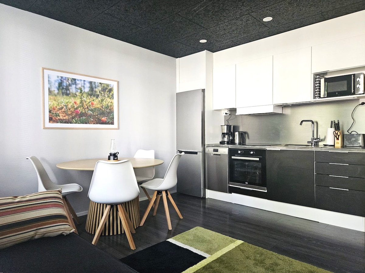 Elegante estudio de 29 m2 con balcón en la 4ª planta a orillas del río Pielisjoki. La tienda más cercana está justo al lado y el centro de Joensuu está al otro lado del río. El apartamento está amueblado específicamente para el uso de Airbnb, tratando de tener en cuenta todas las posibles necesidades de los huéspedes (superficie de trabajo plegable, sofá cama, internet de alta velocidad, cocina bien equipada). Los huéspedes tienen acceso a una plaza de aparcamiento con enchufe justo delante de la puerta principal y las llaves del apartamento se encuentran en la caja de códigos del poste de calefacción.