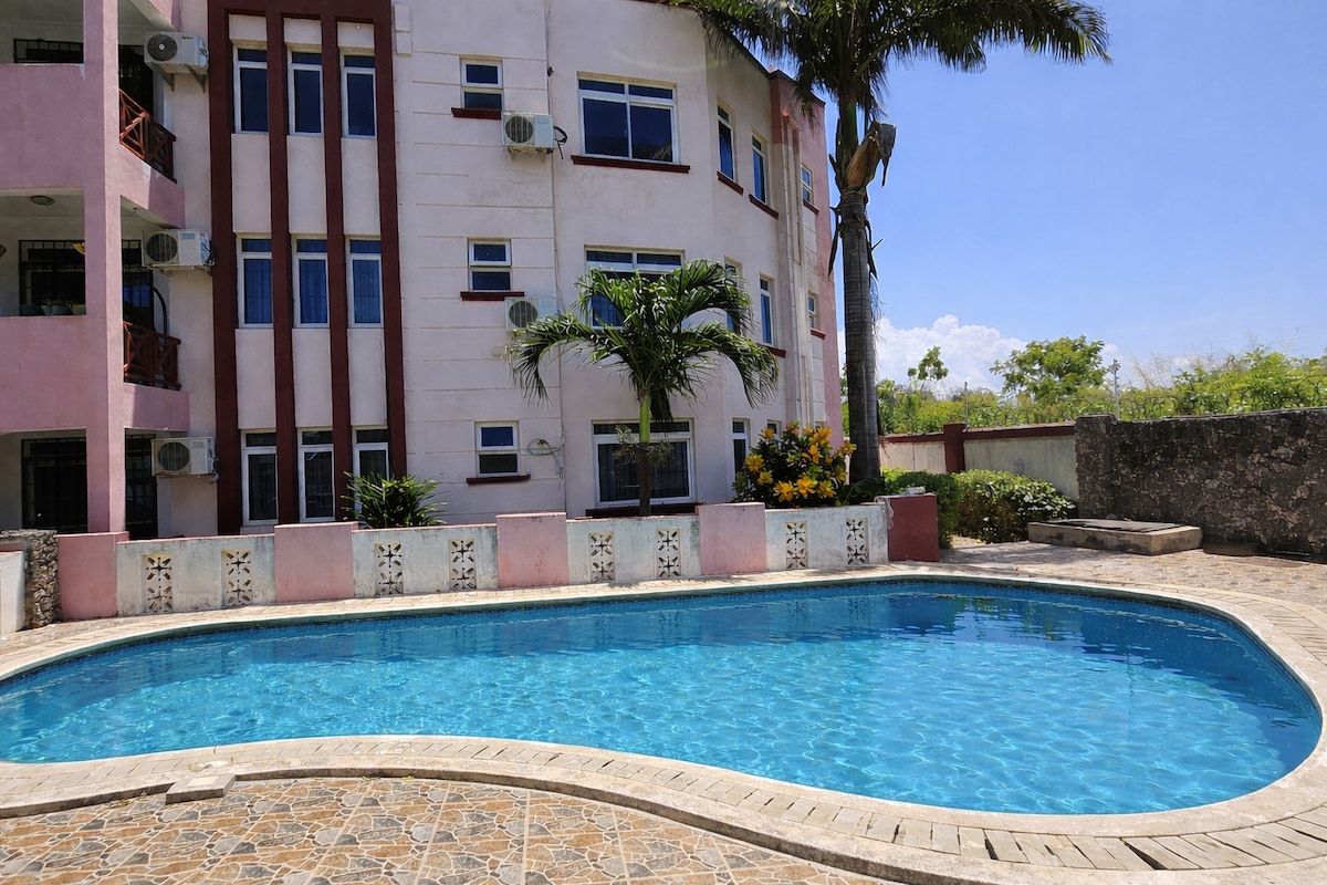 Relax with the whole family at this peaceful beachfroont apartment, located on the ground floor The house fits 6 people Max. The beach is just few stroll, and the malls are close proximity like 8min. Our kitchen is fully equiped. Airconditionar in 2 rooms at a extra fee of 1500ksh per stay. For parents with young ones, our outdoor space is spacious enough for kids to play freely. We are just next to Toscana beach restaurant and we have contacts for food delivery right at our door step.