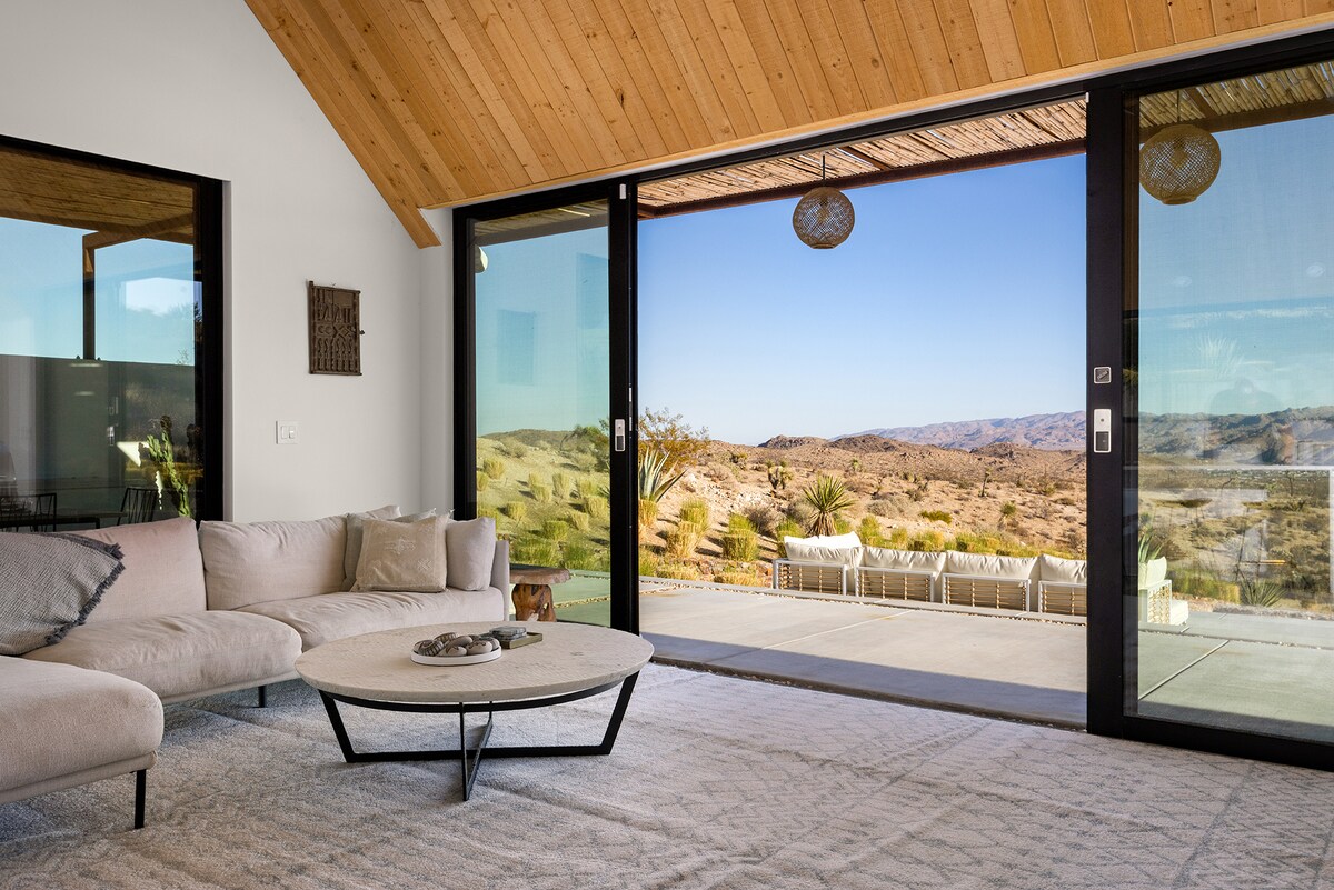 Sumérgete en esta lujosa casa de 3 dormitorios y 2 baños recién construida, con amplias ventanas que revelan los impresionantes paisajes, una piscina climatizada y un spa para disfrutar de baños bajo las estrellas, y un espacio dedicado al fitness. Relájate bajo cielos infinitos en 2 acres en tu propio oasis privado, perfecto para observar las estrellas y reunirse en el patio. Despiértate con impresionantes amaneceres, explora las maravillas de otro mundo de Joshua Tree y vuelve para darte un baño rejuvenecedor en tu refugio en el desierto.