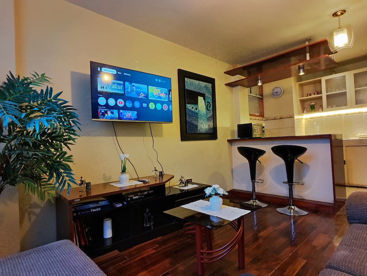 Moderno y tranquilo departamento ubicado en la Zona más Segura del centro de la ciudad de Juliaca, frente a Real Plaza,con todas las comodidades para hacer de su estadía una experiencia cómoda y cálida, en un departamento de 1 habitación con cama Queen y colchón ergonómico de espuma viscoelástica para un mejor descanso, también cuenta con un smart tv de 65" con internet de alta velocidad, 1 sala con vista para apreciar atardeceres, cocina equipada, baño y ducha con agua caliente las 24hrs.
