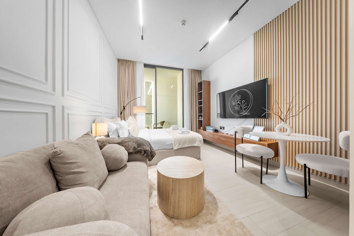 A rare studio in Business Bay with private jacuzzi balcony, dark modern interiors, and a vibe made for comfort and calm. Located in a brand-new tower with a resort-style pool, Technogym-equipped gym, cold plunge, and sauna. Smart entry, ultra-fast Wi-Fi, and everything you need to relax or work in style. Whether you're in Dubai to explore or unwind, this space was built to elevate your stay.