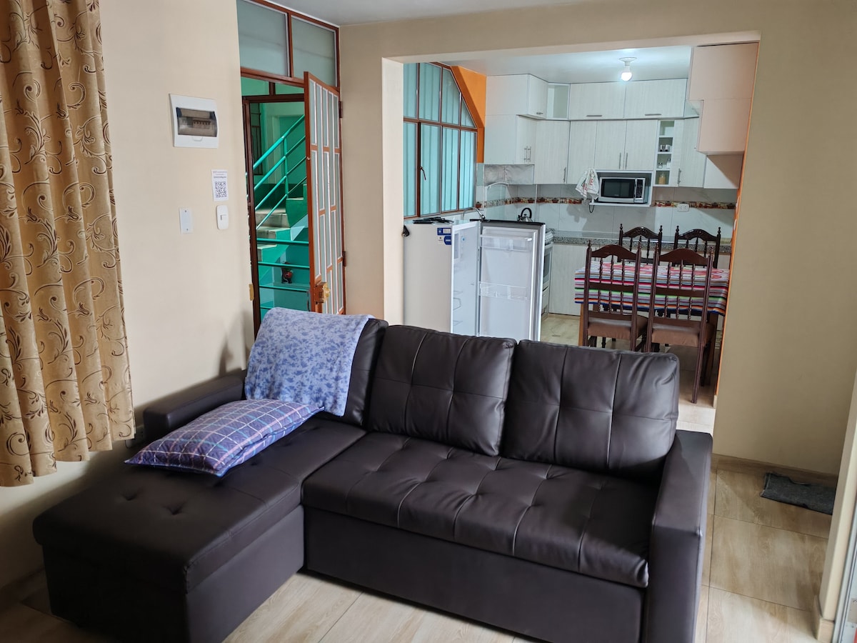 Tómate un descanso y relájate en este tranquilo y acogedor departamento, ubicado a 2 cuadras de la plaza principal, cerca de restaurantes, bancos, centros comerciales, agencias turísticas, etc. Seguro y silencioso cuenta con: TV + Paramount, cocina, frigobar, agua caliente, microondas, lavadora, etc. cochera gratuita, cómodo y seguro para usted y su familia, Cuanta con dos habitaciones, tres camas, un baño, cocina sala y todo el equipamiento necesario para una estadía placentera.