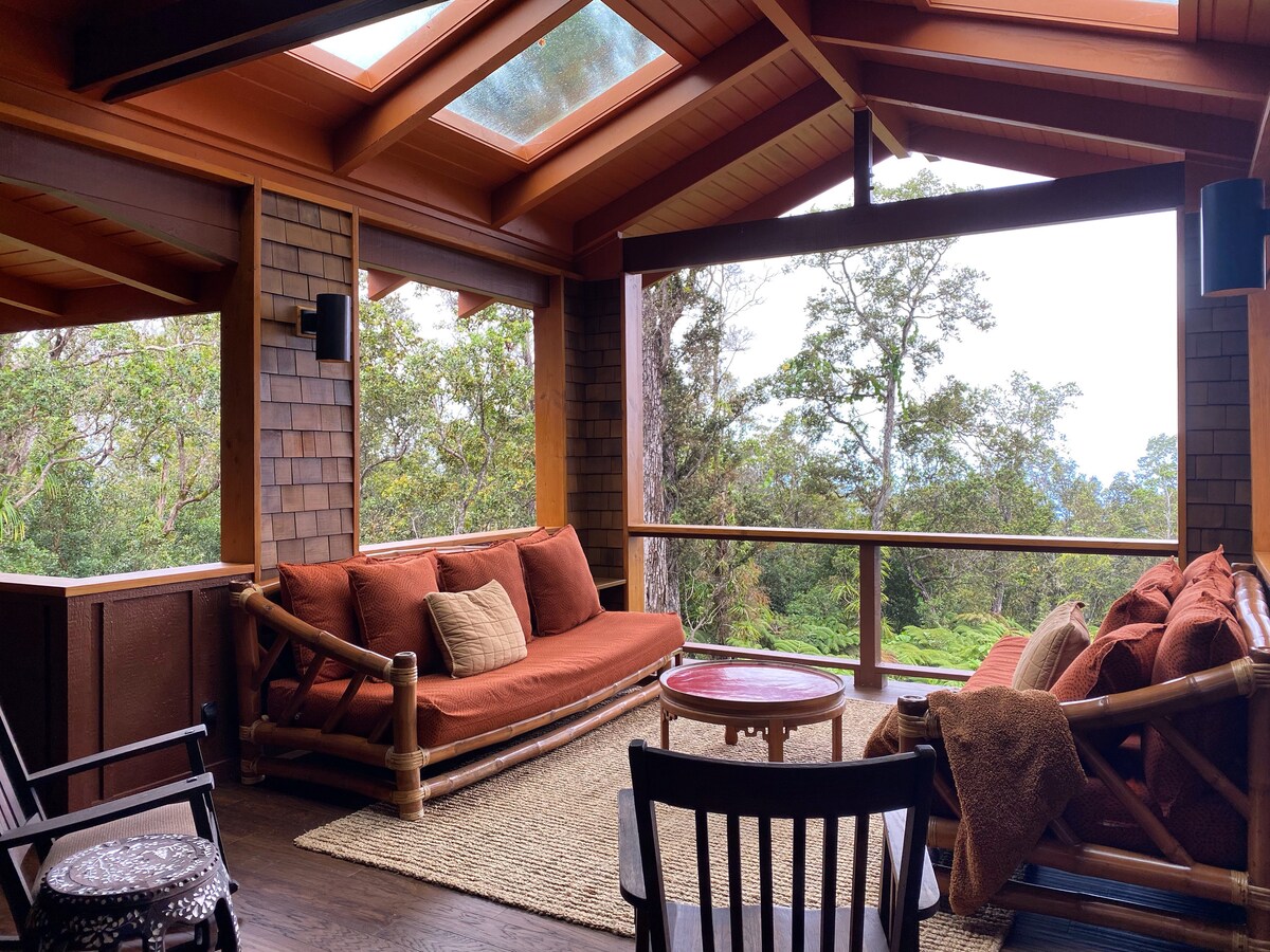 Este alquiler se encuentra en 6 acres en el único bosque nuboso hawaiano. Las mañanas son soleadas y frescas. Alimentamos a las aves que atraen a una bandada de cacatúas blancas, pinzones, faisanes y cardenales. El estanque y el bosque también atraen a más especies de aves. Las tardes pueden ver la niebla o la lluvia, y luego despejar los cielos para puestas de sol extraordinarias. Los cielos nocturnos están llenos de estrellas. Ubicación tranquila y silenciosa lejos de las multitudes turísticas y el calor de la costa, pero a 15 minutos del aeropuerto, la ciudad y las playas.