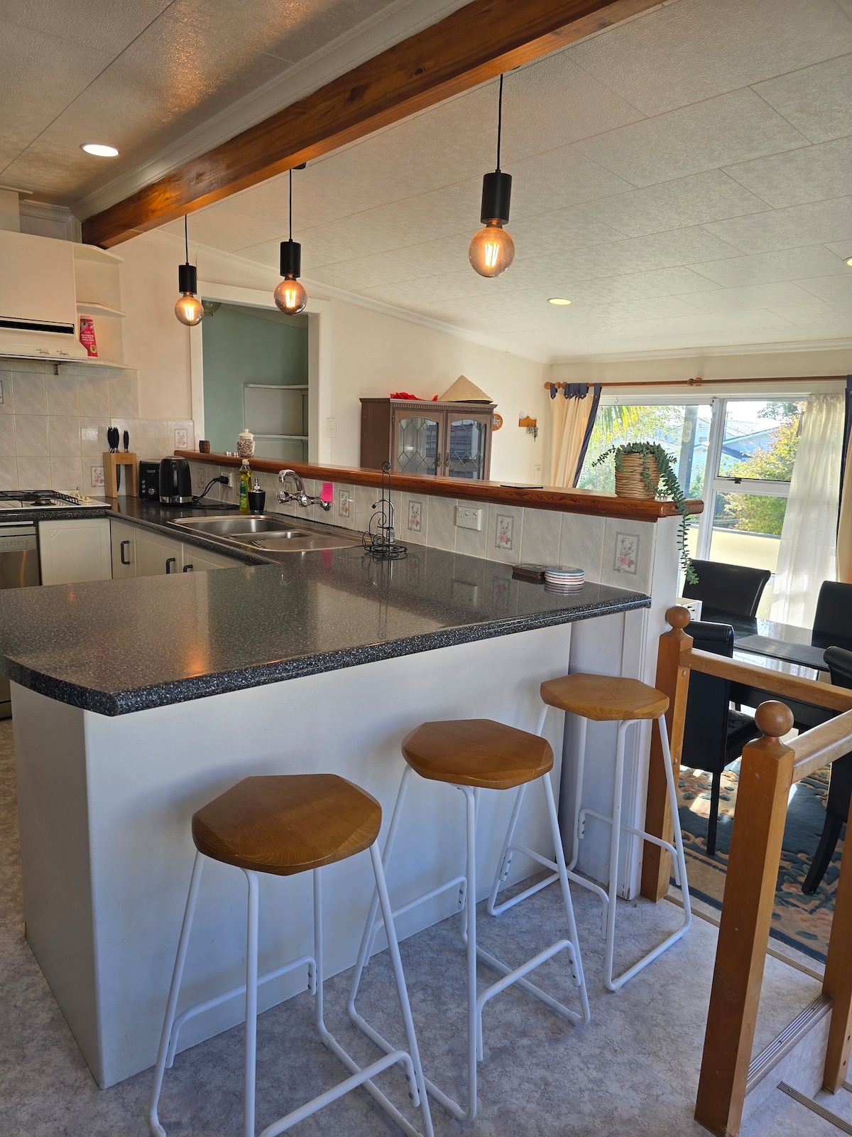 Vistas panorámicas al mar, a 1 minuto a pie de la playa, surf, kayak, senderismo por el monte Taranaki o en bicicleta por el sendero costero. A 3 minutos del parque infantil. Dormitorio principal con baño privado arriba. Cocina bien equipada con vitrocerámica de gas, horno, microondas, TV, Netflix y wifi gratuito. A 15-20 minutos de New Plymouth. A 10 minutos del aeropuerto. A 40 minutos de White Cliffs Walk, a 15 minutos del Festival de las Luces de Pukekura Park. A 35 minutos del monte Taranaki. Algunos reservan para 1 huésped y se presentan 6. Así que revisamos nuestra cámara de la puerta. Por favor, sé honesto.