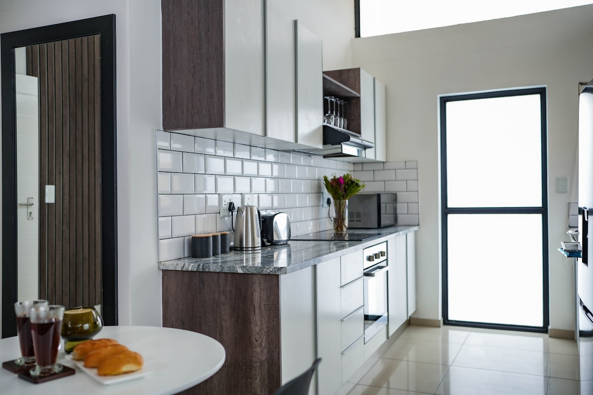 🌟 Your Home Away from Home! 🌟 Enjoy comfort and convenience in our air-conditioned 2-bedroom apartment with one Queen en-suite bedroom and a King/Twin spacious bed and bathroom. 🍳 Cook in the fully equipped kitchen, do laundry with the washing machine, and relax or BBQ on your private patio. ☕ Start your day with breakfast, visit the unisex salon 💇♀️ or grab a snack and drinks from the tuck shop 🍫. 🛡️ Secure, peaceful, and welcoming — your perfect home away from home! 🏡💛