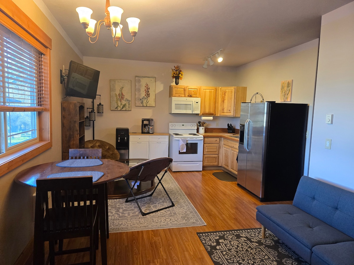 A quaint location! This bungalow is perfect for summer adventures. We are only 10 miles from Glacier Natl Park. In a 2 mile radius are antique shops, 3 cafés, a grocer & fuel. This is a cozy loft like apartment. The full bath and queen size bed are upstairs. The sofa chair upstairs does pull out to a single bed, which is perfect for a couple with a child. The kitchen is small but has everything a small group would need.