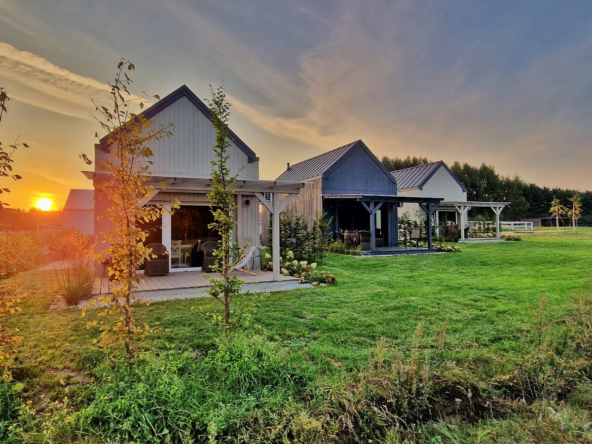 Río frente a la cubierta, bosque alrededor, media hectárea solo para ti. Los días comienzan con café y respiraciones conscientes, y terminan con una sauna, un chapuzón en la piscina fría y una bañera de hidromasaje tranquila bajo las estrellas. Cabaña de madera (6 personas): 2 dormitorios + sofá cama, chimenea, cenador junto al río, bar en la piscina, rincones de descanso. Sin zonas compartidas: intimidad total y ambiente boho-slow durante todo el año.