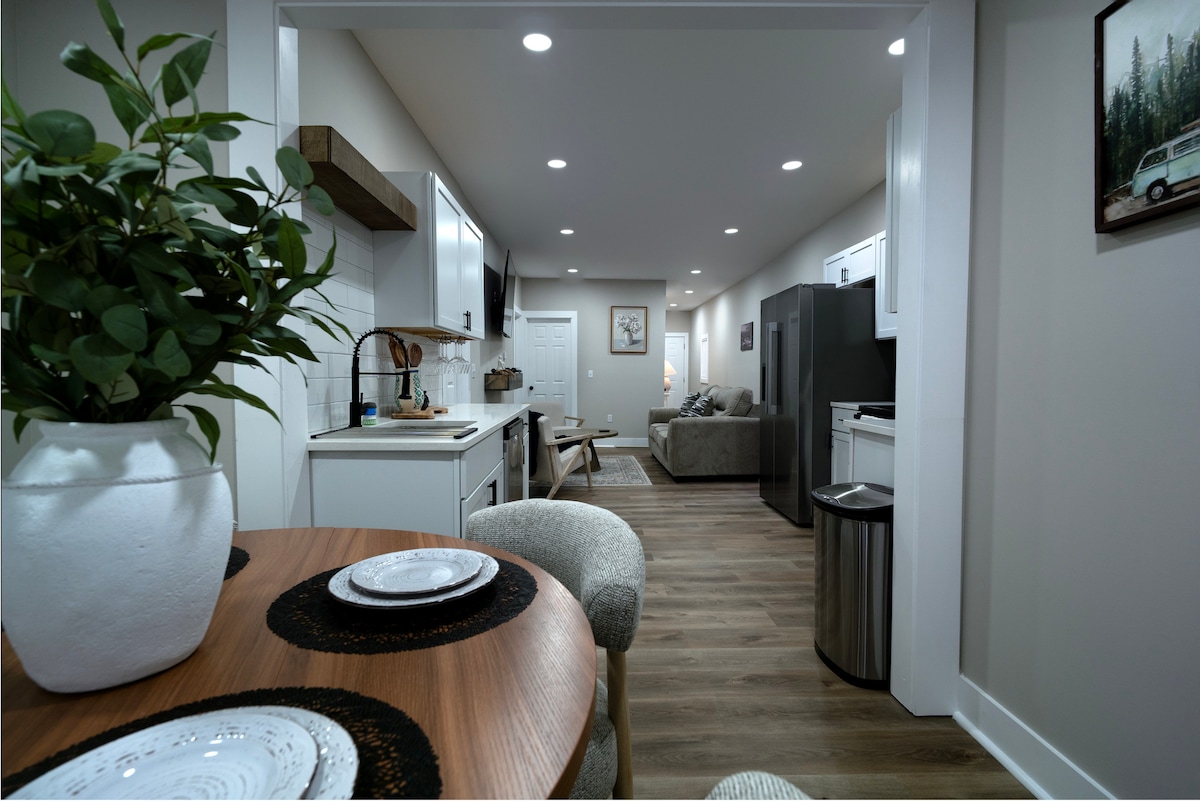 Casa adosada recién reformada, vibrante y elegante. Con 3 dormitorios y 1 baño. Cocina totalmente equipada, lavadora/secadora, televisores inteligentes, wifi de alta velocidad con capacidad de transmisión, bar cafetería, parrilla, patio al aire libre con asientos y acceso a 4 piscinas al aire libre del vecindario (de temporada, generalmente desde el Día de los Caídos hasta el Día del Trabajo), canchas de tenis y otros servicios. Ubicada en un barrio seguro y tranquilo en Lenexa con fácil acceso a las interestatales I35 e I435.