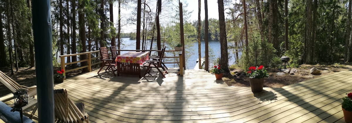 Tässä ainutlaatuisessa ja rauhallisessa mökissä on helppo rentoutua. Ulkona kuulet luonnon äänet ja yöllä voit katsoa tähtiä ilman valosaastetta. - sängyt kuudelle majoittujalle - leveä vuodesohva kahdelle - puusauna - polttopuut sisältyvät hintaan - järvi ja soutuvene käytettävissä - oma ranta ja laituri - kaasugrilli ulkona ja hyvin varusteltu keittiö sisällä - ilmastointi ja lämmitys - takka - sähköt - astianpesukone - vesi tulee sisälle, juomavesi tuotava mukana - rauhallinen sijainti
