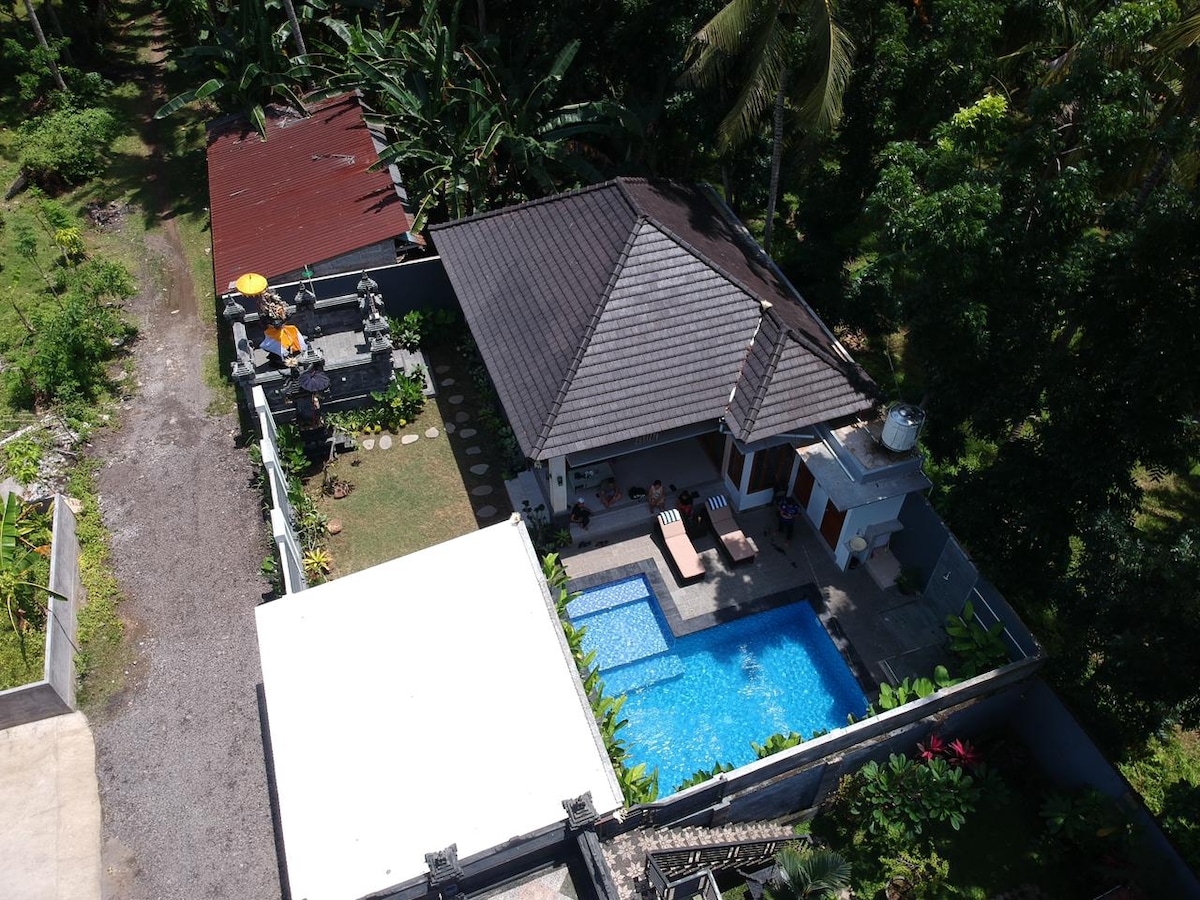 Your very own Beach House with a pool . Perfect for a family vacation, quality time with a group, or a romantic getaway. 3 bedrooms with AirCon, 3 baths. Swim in a 10-meter long pool, jump in the ocean. Some of the best diving & snorkeling on the coast just out the gate. Recline & rejuvenate in a variety of delightful private spaces, the bale with cushions & pergola and pool with sunbeds&hammocks. The owner/chef is renowned for having the Best Balinese food in Bali, served to you by the ocean.