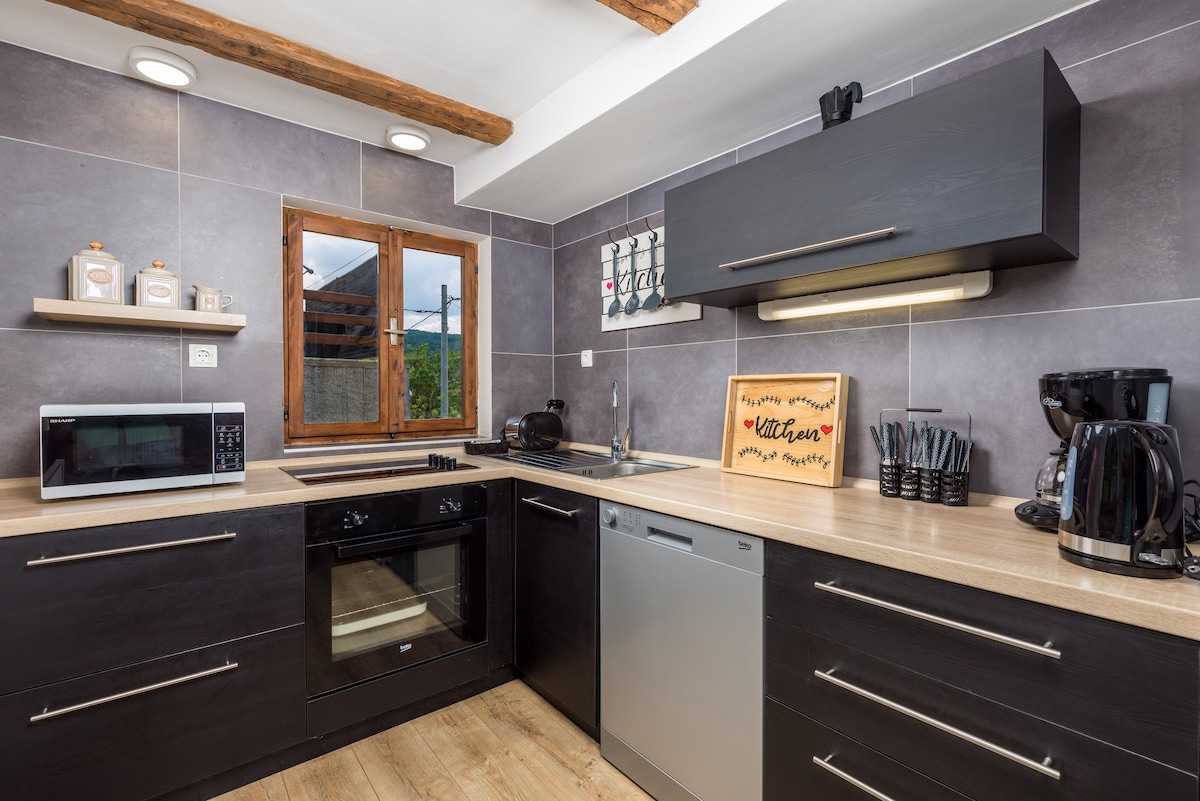 Disfrute de nuestra casa de roble, que se encuentra en el pequeño pueblo de Ladešići, a orillas del río Kupa. La combinación de madera y diseño rústico ofrece a los huéspedes una experiencia superior, un oasis de paz y comodidad total. Un ambiente adicional es creado por la estufa de leña. Después de un día lleno de actividades en el río Kupa, pescando o caminando, relájese en las hamacas o columpios. Disfrute de la naturaleza virgen del paisaje del río Kupa y de la casa que lo abrazará como si estuviera en su propia casa. Uso de kayak del 15.06. - 15.09.