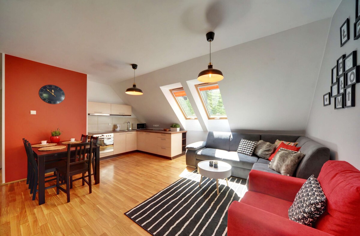 El apartamento Słoneczna Panorama es un estudio diseñado para 3 personas. El área de aprox. 28 m2 consta de una sala de estar con un anexo y una zona de estar, y un baño. El apartamento tiene un gran balcón orientado al sur donde puedes relajarte después de caminatas y llenar tus ojos con las vistas. Como parte de tu estancia, puedes utilizar el espacio de estacionamiento gratuito en el garaje subterráneo. También permitimos un perro por una tarifa adicional.