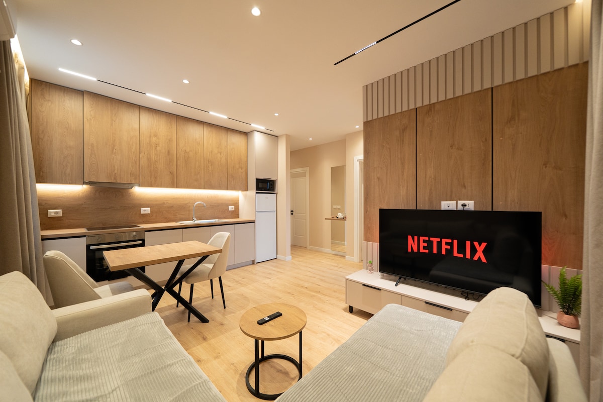 ¡Bienvenido a nuestro elegante y cómodo apartamento de un dormitorio, perfecto para parejas, viajeros solitarios o grupos pequeños! Situado en el centro de Kamëz, nuestro apartamento ofrece fácil acceso a todo lo que necesitas. A solo 10 minutos del Aeropuerto Internacional de Albania y a 15 minutos del centro de la ciudad de Tirana, es una base ideal tanto para viajeros de negocios como de placer. En el interior, encontrarás una cocina totalmente equipada, una acogedora sala de estar con un sofá cama y una decoración moderna y acogedora que te hace sentir como en casa .