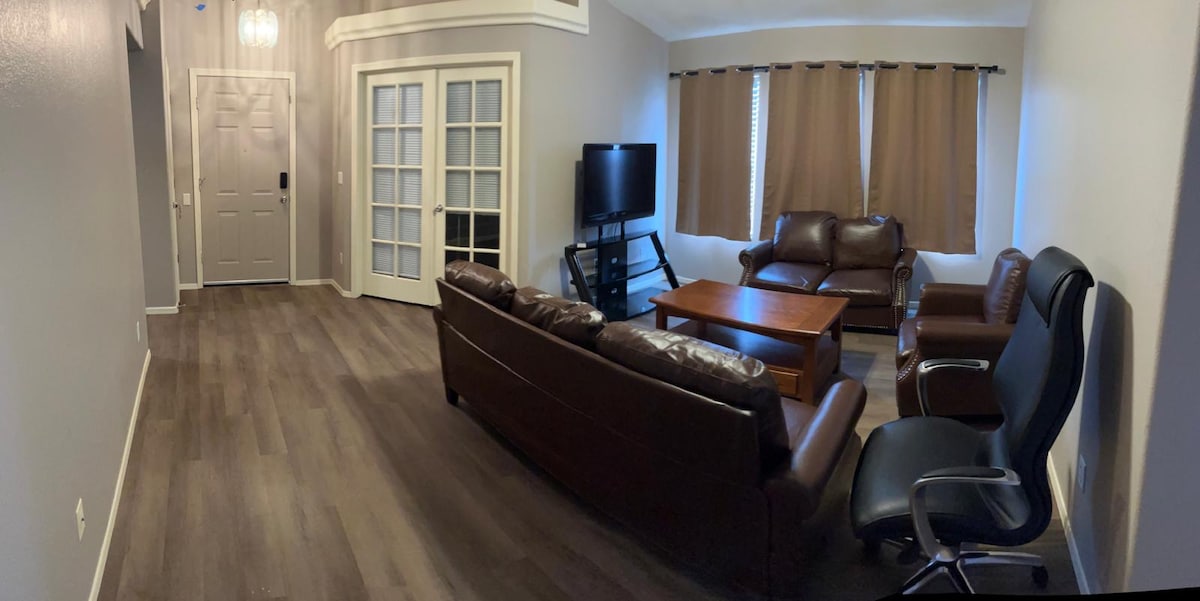 Gran casa moderna con un oasis privado en el desierto: pasa un fin de semana relajante alrededor de la piscina o disfruta de una reunión familiar en el gran patio trasero bellamente ajardinado. Shuffleboard, ping pong, mesa de billar y mucho más, este alojamiento tiene todo lo que necesitas. Esta casa cuenta con un garaje profundo para botes de 3 autos, por lo que hay mucho espacio para estacionar y almacenar tus juguetes acuáticos o del desierto. También hay una entrada extra larga a lo largo del lateral derecho de la casa para estacionamiento adicional. Se admiten mascotas. Consulta para grandes reuniones.