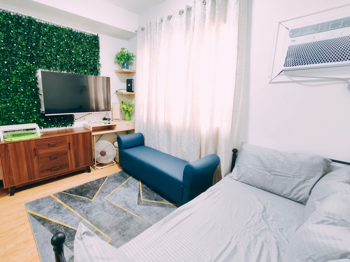 La unidad de apartamento está a poca distancia a pie de restaurantes, tiendas, un hospital y el centro comercial Ayala. El entorno es seguro. Hay seguridad las 24 horas y personal asignado en el vestíbulo. En el edificio hay ascensor. El interior de la unidad de estudio es acogedor y cómodo. Viene con 2 camas de matrimonio. Puede alojar hasta 3 huéspedes. Se proporciona conexión wifi a internet, ideal para llamadas por internet y navegar por la web.