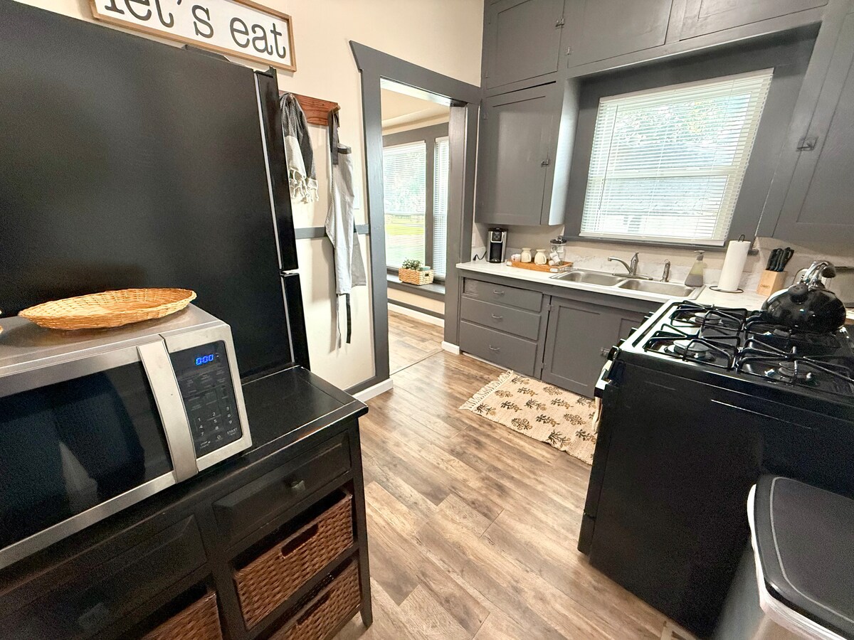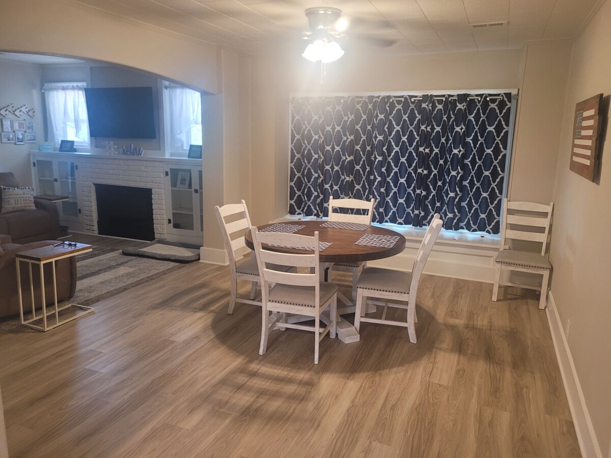 Bungalow Tudor remodelado, ¡favorito de los huéspedes! 3BR/2BA con una suite king dividida, más DOS salas de estar para que todos puedan repartirse. Cocina totalmente surtida, televisores en todas las habitaciones y conexión Wi-Fi rápida. Patio trasero privado cercado con parrilla, ideal para niños y mascotas. Estacionamiento fácil y cerca del centro de Arkansas City. Perfecto para familias, amigos, viajes de trabajo y estadías más largas.