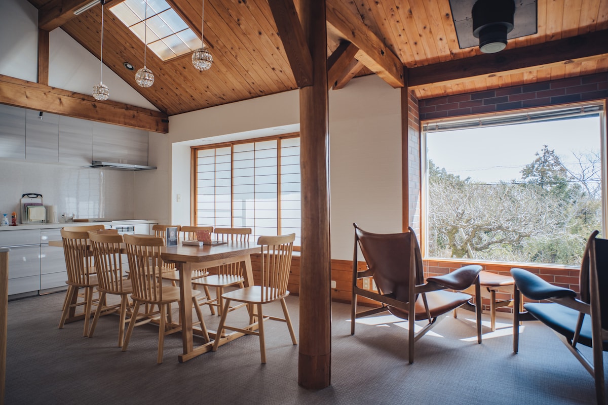 Experimenta los extraordinarios sonidos de la naturaleza en una casa de campo con vistas al mar. Hay una casa de campo en el parque nacional de Tanushi, pasando por el punto de poder Heart Cave Ryugu (modelo para "Ponyo" de Ghibli), y la playa de Tanushi. Al entrar por la puerta principal de la cabaña, el verde de los árboles y la luz brillante del océano saltan en tus ojos.El salón de 20 tatamis con techo alto tiene un sofá, cocina, loft y chimenea en invierno, y es un espacio relajante para familias y amigos. Cuando sales por la ventana a la terraza, puedes ver el cielo y el mar extendiéndose desde el mar.Puedes sentir lujosamente la cómoda brisa y el cielo que fluye lentamente en el jacuzzi y la hamaca. Desde la terraza, sube un tramo más de escaleras hasta la plataforma de observación.Solo hay naturaleza hasta donde alcanza la vista.El paisaje impresionante se extiende. El flujo relajado del mar y los barcos de pesca en Izu, puedes escuchar el sonido de los pájaros en el arroyo.Es una gran desintoxicación. Luego, baja un piso para disfrutar de una barbacoa de carbón mientras escuchas el murmullo del río en el bosque.Fue delicioso, divertido y un gran recuerdo. Por la noche, el cielo estrellado es deslumbrante, y si hace buen tiempo, ¡puedes ver estrellas fugaces!Puedes disfrutar de la belleza del cielo.