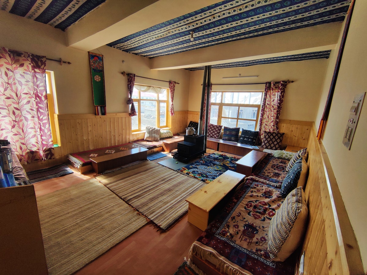 Nuestro "hogar en el borde" del pintoresco pueblo de Pangmo, Spiti, ofrece vistas impresionantes del valle con el río Spiti fluyendo justo debajo; deliciosa comida local; y la oportunidad de explorar el humilde estilo de vida Spitian. Somos la única casa de familia en todo el pueblo. 📍 Ubicación: a 26 km de Kaza. 🍽️ Para cenar: comidas locales vegetarianas y no vegetarianas servidas en nuestro comedor tradicional. No te pierdas las vistas de la Vía Láctea en las noches sin luna y las montañas plateadas cubiertas de hielo en una de luna llena.