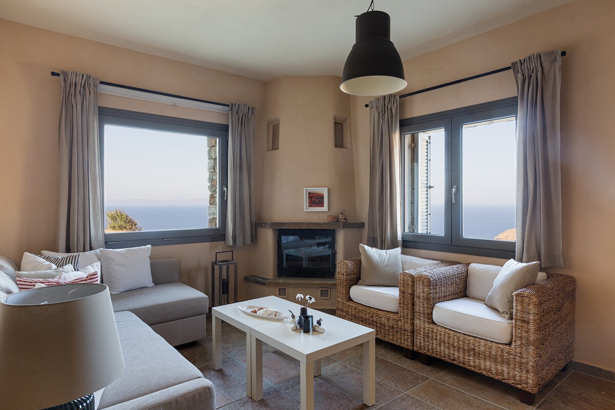 Casa de campo con vistas infinitas al mar Egeo. Se encuentra a 430 metros sobre el mar y a 4 km de la playa de Orkos e Ioulida(Chora). El paisaje de roble ofrece a los huéspedes serenidad, terminando con el maravilloso amanecer que emerge del mar, iluminando las islas Cícladas que se distinguen. Ven y prueba los productos tradicionales de los propietarios y experimenta una hospitalidad única.