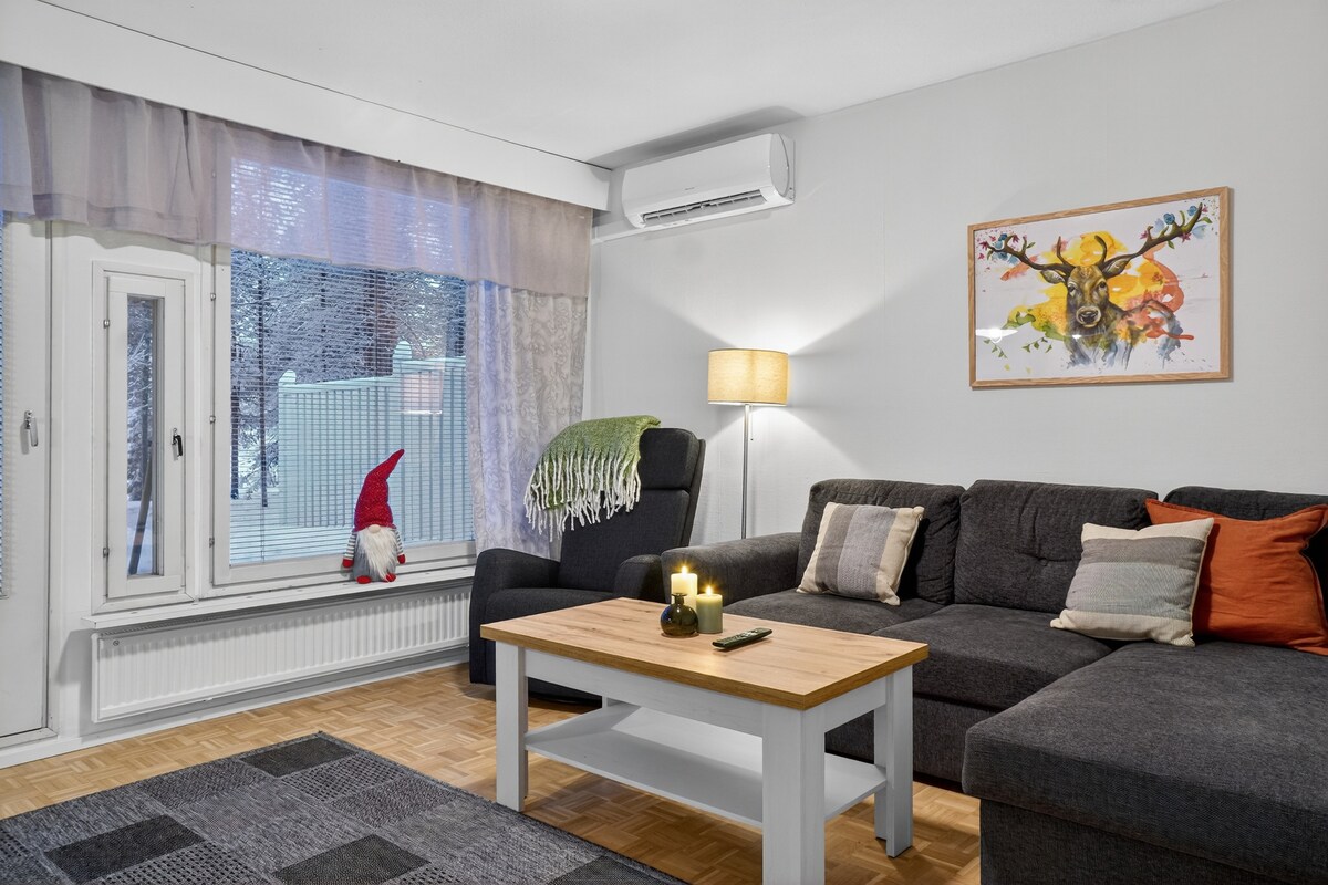 Renovado (fotos de la cocina actualizadas), espacioso y acogedor apartamento en un barrio tranquilo, a 5 km del centro de Rovaniemi. El apartamento tiene un dormitorio con una cómoda cama tamaño queen, una amplia sala de estar con cocina completa y sofá cama, así como una zona de loft. Se nos puede contactar fácilmente ya que vivimos en el mismo edificio y estaremos encantados de ayudarte con cualquier cosa. La zona es tranquila y cerca de la naturaleza, con un hermoso lago cerca. Tenemos dos bicicletas para nuestros huéspedes.
