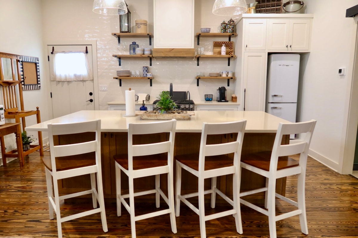 Esta acogedora casita inspirada en Texas es la ubicación perfecta para todas tus aventuras en Hill Country. Estarás a pocos pasos de las tiendas únicas de Comfort, restaurantes locales y vinotecas. La cocina está totalmente equipada con todas las necesidades para crear una comida maravillosa junto con una estufa de gas con horno eléctrico. La cama tamaño king del dormitorio y el televisor de 55pulgadas son perfectos para relajarse después de tu día explorando el área. El baño tiene tocadores dobles, ducha a ras de suelo y inodoro separado para mayor privacidad.