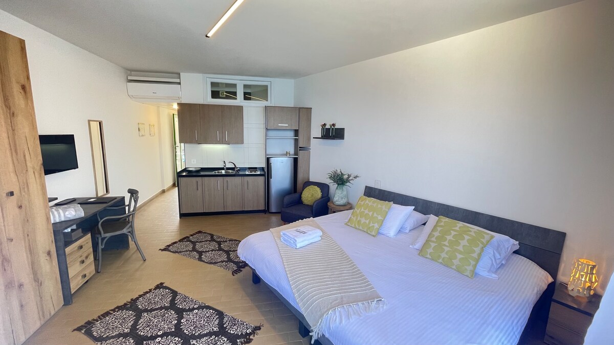 Este lugar único tiene un estilo propio. El dormitorio principal tiene una cama tamaño queen y una ventana con vistas al mar Mediterráneo. Un gran armario con espejo, vestidor, mesita de noche, baño principal y ducha. La cocina tiene una nevera, microondas, estufa, eliminación de basura, lavadora/secadora y una barra de bar. La sala de estar tiene una cama segura y almacenamiento adicional. Televisión grande. Internet gratis. Baño y ducha para huéspedes. Balcón. Cochera bajo tierra. Acceso a todos los servicios del centro vacacional Piscinas, cancha de tenis, restaurantes