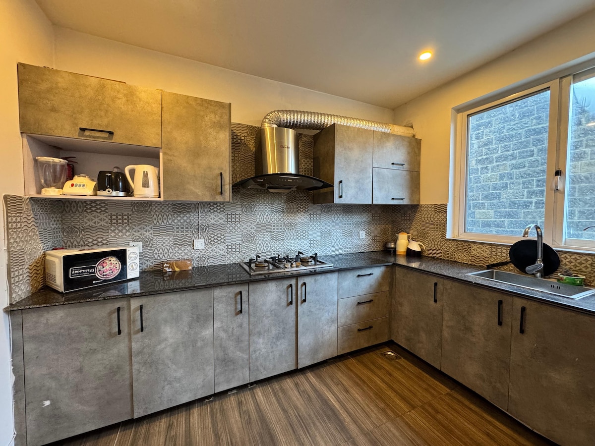 Apartamento de lujo de 3 dormitorios en Murree Disfruta de una estancia tranquila en este apartamento de 3 camas de diseño único cerca del MIT, Lower Jhika Gali Road. Cuenta con 2 camas tamaño king, 2 camas individuales, cocina y salón de planta abierta, TV inteligente, gran terraza con vistas a la montaña, seguridad 24/7, respaldo de UPS y estacionamiento gratuito. Alojamiento para cocinar y conductor disponible por un cargo extra. Solo para parejas y familias. A 5 minutos del bazar de Jhika Gali, a 10 minutos de Mall Road.