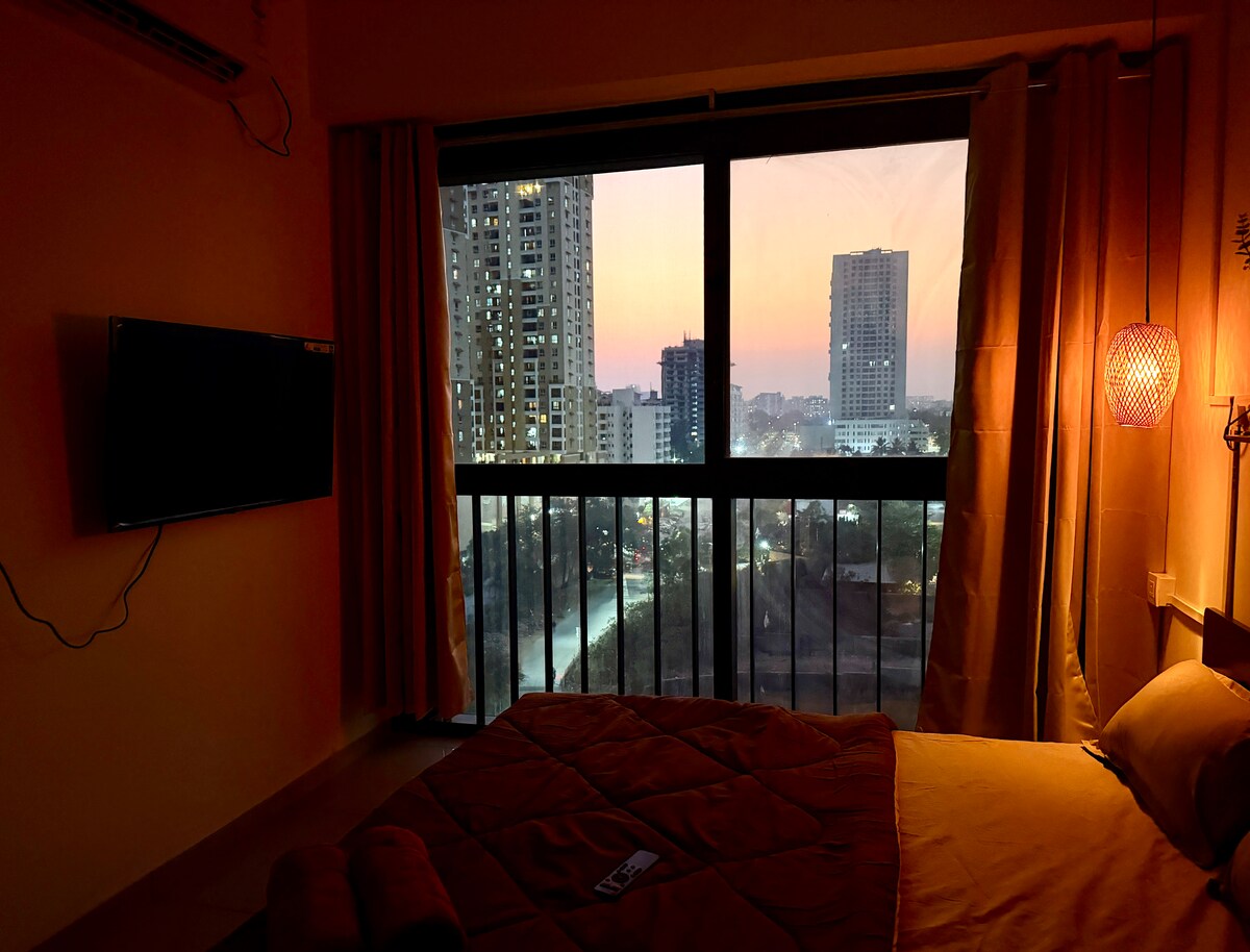 Relax in this modern, fully furnished studio designed for comfort and productivity. Enjoy a cozy living area with TV, dining table, and center table. The bedroom comes with a comfortable bed, private kitchen, and a balcony featuring a hanging chair. Guests also get access to co-working space and a gym, making it ideal for work trips or long stays. A perfect blend of comfort,convenience, and lifestyle living.