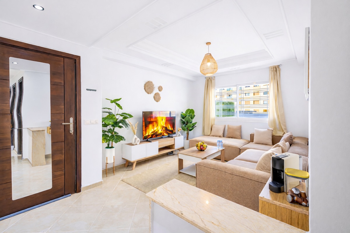 Apartamento muy bien situado en el centro de Rabat, a estrenar, muy bien comunicado: tranvía y pequeño taxi a 2 minutos. Dispone de dormitorio, baño, cocina americana bien equipada (fogones, horno, nevera, vajilla, lavadora, tostadora, hervidor, etc.), salón doble con comedor, sofá cama, Smart TV con acceso a Netflix y balcón. Edificio seguro. Todo lo necesario para una estancia agradable y cómoda en el corazón de la capital.