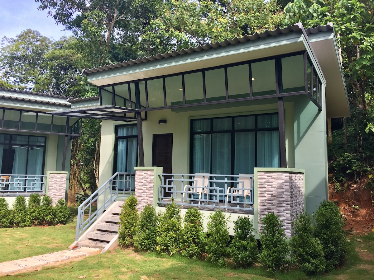 Bungalow de 5o m2 con dos dormitorios The Bungalows está ubicado en la parte superior de la carretera principal en Khuk kak. Los bungalows se encuentran a aproximadamente 3 km de la playa. Se encuentra en una zona tranquila y tranquila, cerca del río y verás la selva desde el porche de los bungalows cuando te despiertes por la mañana. Todos los bungalows tienen aire acondicionado en la habitación, agua caliente, ventiladores, cocina y WiFi por fibra.