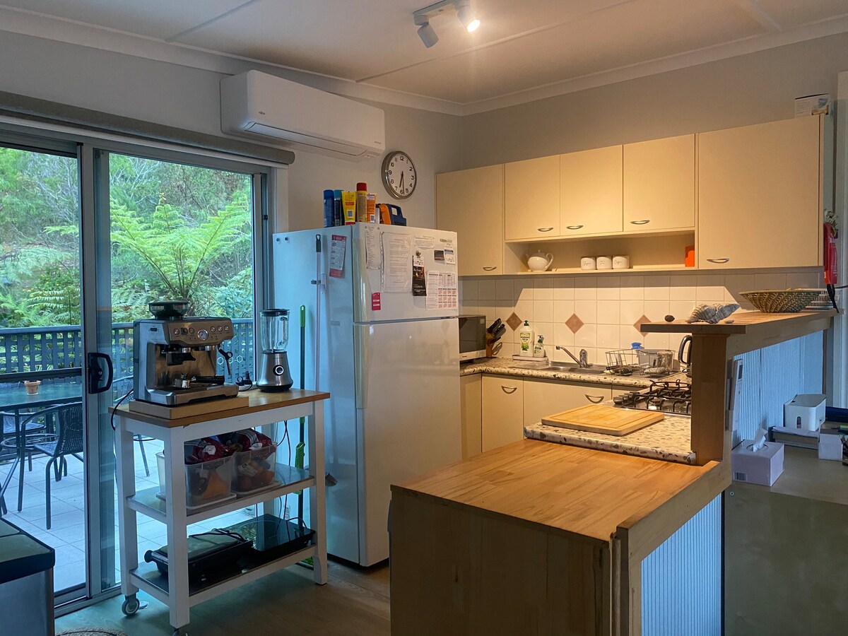 Una propiedad limpia, elegante y espaciosa que admite mascotas ubicada a solo 5 minutos en coche de la Princess Highway en una pintoresca propiedad de 7 acres de eucaliptos azules. La casa de campo ofrece mucho espacio para la familia con una sala de estar de planta abierta, comedor y salón con una acogedora chimenea de leña y ventiladores de techo. Disfruta sentado en la zona de la terraza privada contemplando la serenidad, disfrutando de la vida de las aves locales o relajándote alrededor de la hoguera.