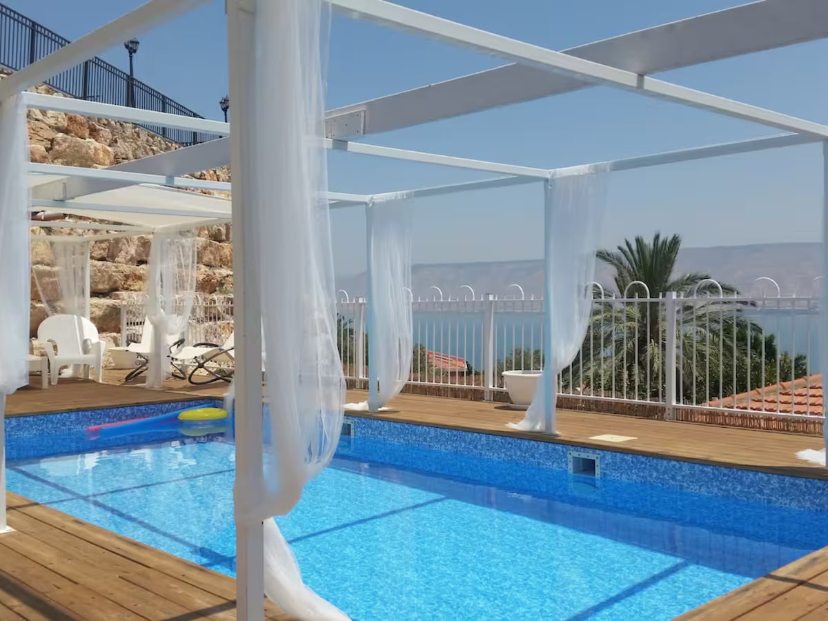 Unas maravillosas vacaciones en un apartamento con jardín ubicado en la ciudad norteña de Tiberíades. Un departamento de ensueño con una piscina que se puede calentar. Nuestros huéspedes disfrutarán de un apartamento bien equipado que incluye todo lo necesario para unas vacaciones perfectas. El departamento tiene cuatro dormitorios, dos baños bien equipados y cómodos. Un mágico jardín privado con una piscina de ensueño, un balcón con una vista increíble del mar de Galilea por la mañana y por la noche las luces de la noche de la ciudad de Tiberíades.