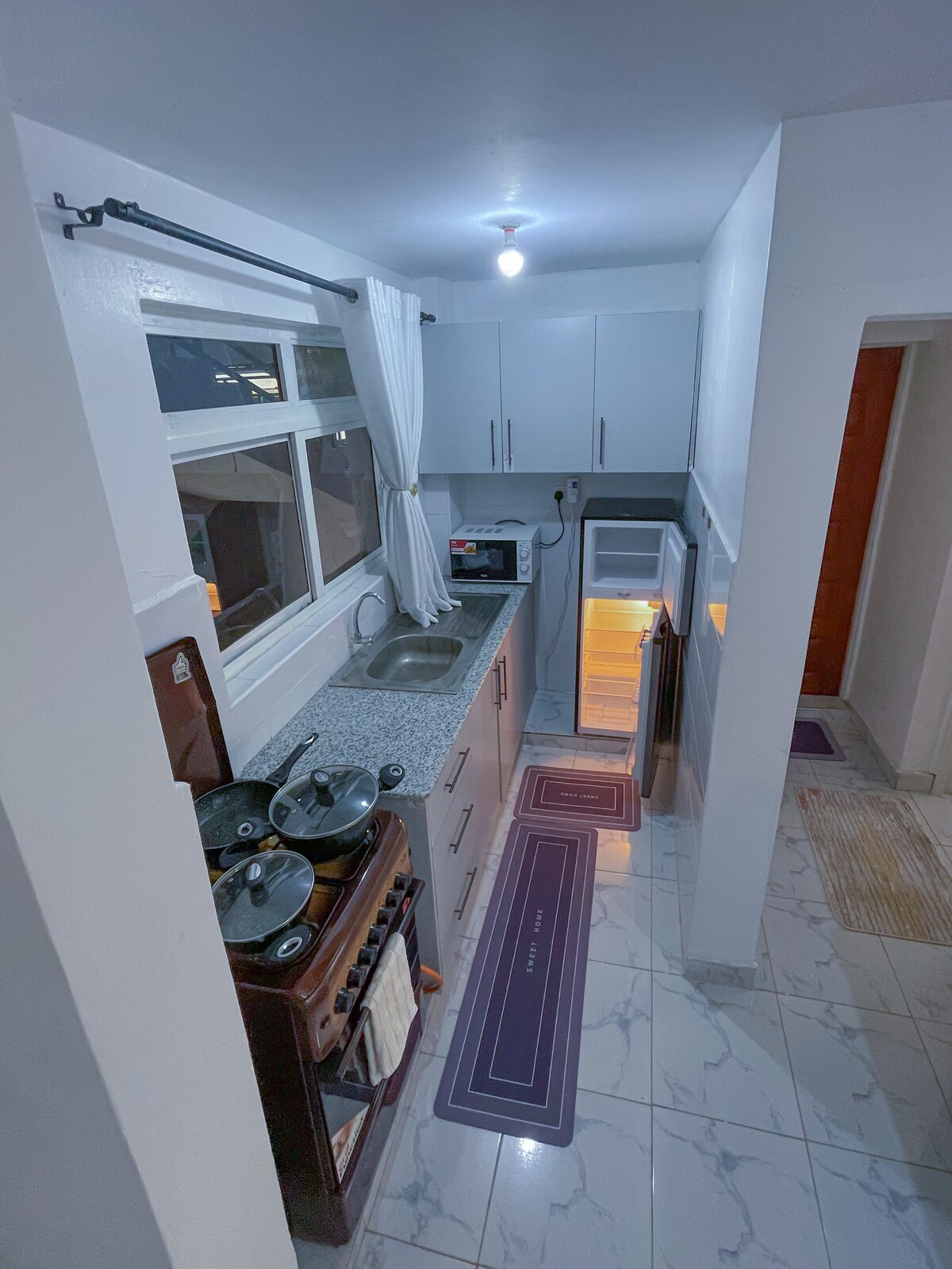 Apartamento de dos dormitorios en un barrio sereno y seguro de Kisumu. Está convenientemente ubicado a pocos pasos de transporte público, centros comerciales, mercados y lugares de culto. Amueblado con gusto para su comodidad con una capacidad máxima de cinco personas; es el lugar perfecto para alojarse de vacaciones o de negocios, para viajes familiares o individuales, estancias cortas o largas.