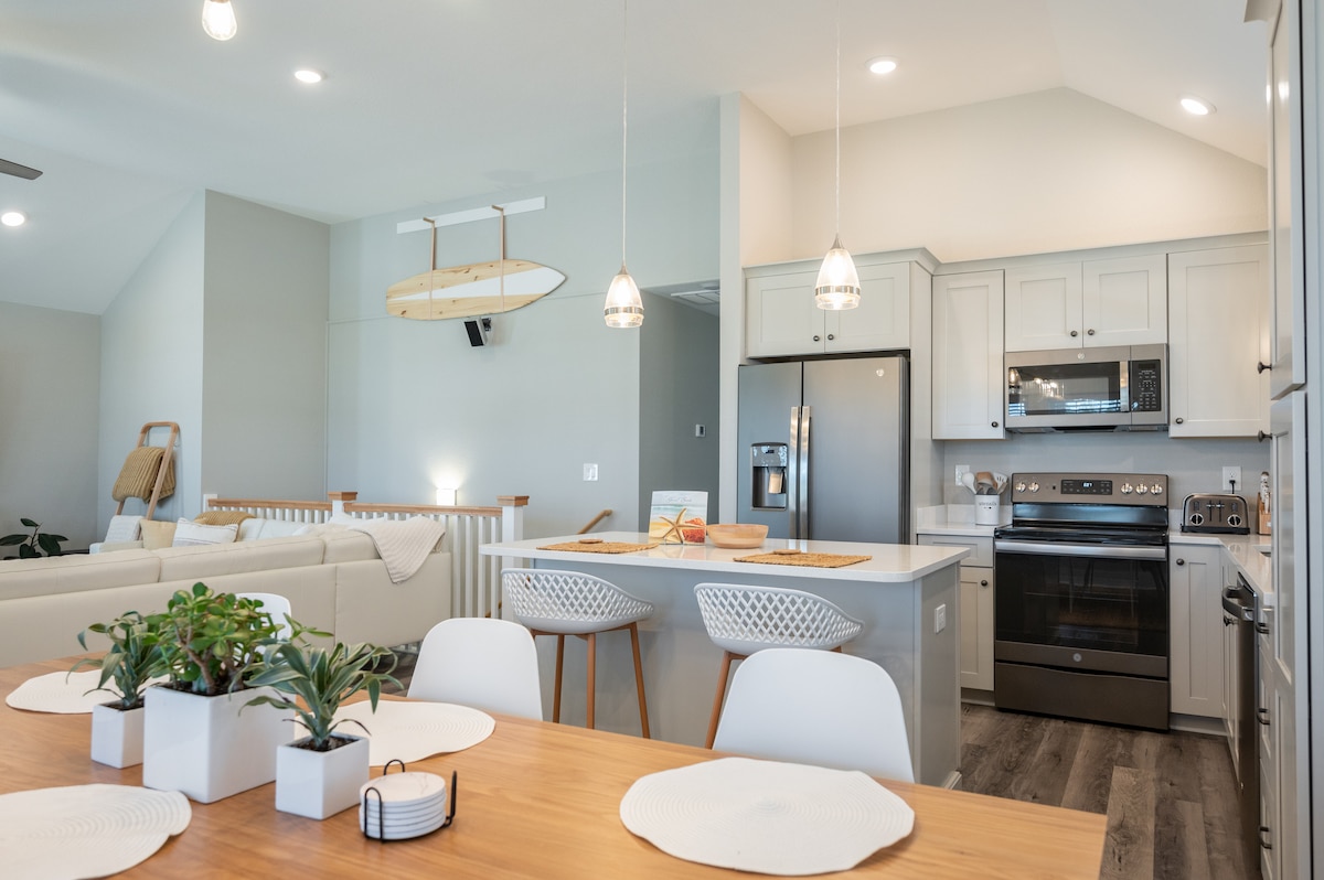 Esta es la unidad de arriba de una casa de dos unidades, y está situada en el centro de Kill Devil Hills, a unas 0,6 millas de la playa. El interior está elegantemente decorado con un plano de planta abierta y techos de catedral. Tiene una cocina completa con casi todo lo que se te ocurra, con una gran mesa de comedor y una isla de cocina. La sala de estar tiene un sofá envolvente hecho para relajarse y un televisor de 85 pulgadas con sonido envolvente Dolby Atmos 9.1 para relajarse y ver tus programas favoritos o algo nuevo.