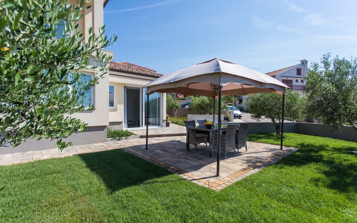 El apartamento está situado cerca del centro de la ciudad de Opatija, a solo unos minutos en coche o a ocho minutos a pie. Consta de una sala de estar, dormitorio, un comedor, dos baños, cocina, sauna, salón de espacio abierto, terraza, un jardín circundante y un estacionamiento. Gracias al hecho de estar en la planta baja con un jardín circundante, tienes la sensación de alquilar una casa y no un apartamento.