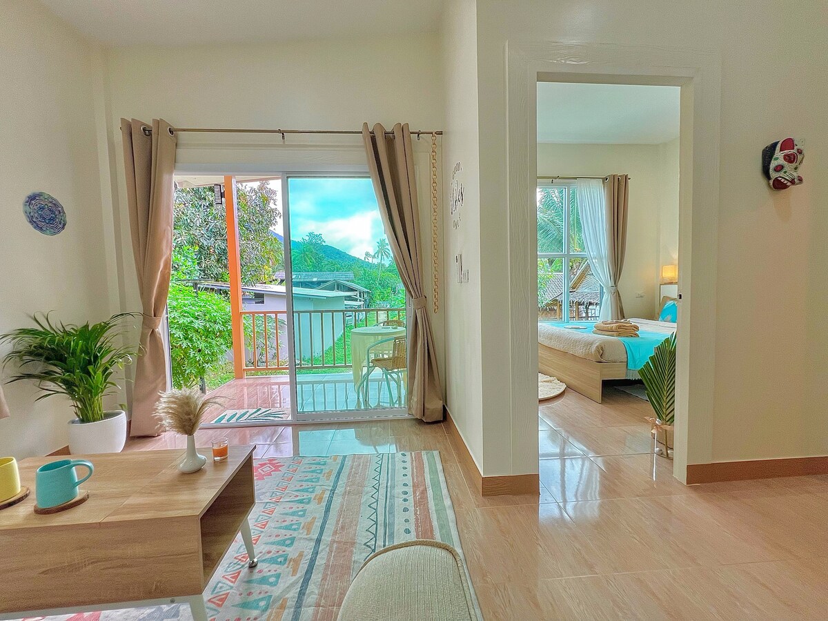 Escape to a pro-designed tropical loft where gigabit fiber meets jungle serenity. Perfect for remote workers craving focus without sacrificing island life. Wake in your bamboo-ceiling bedroom, brew espresso in the fully-equipped kitchen, then choose your workspace: sun-drenched desk inside or thatched-roof coworking pavilion by the pool. Steps from Chaloklum's authentic fishing village with fresh seafood and quiet beaches. Orthopedic mattress, weekly cleaning, concierge for adventures