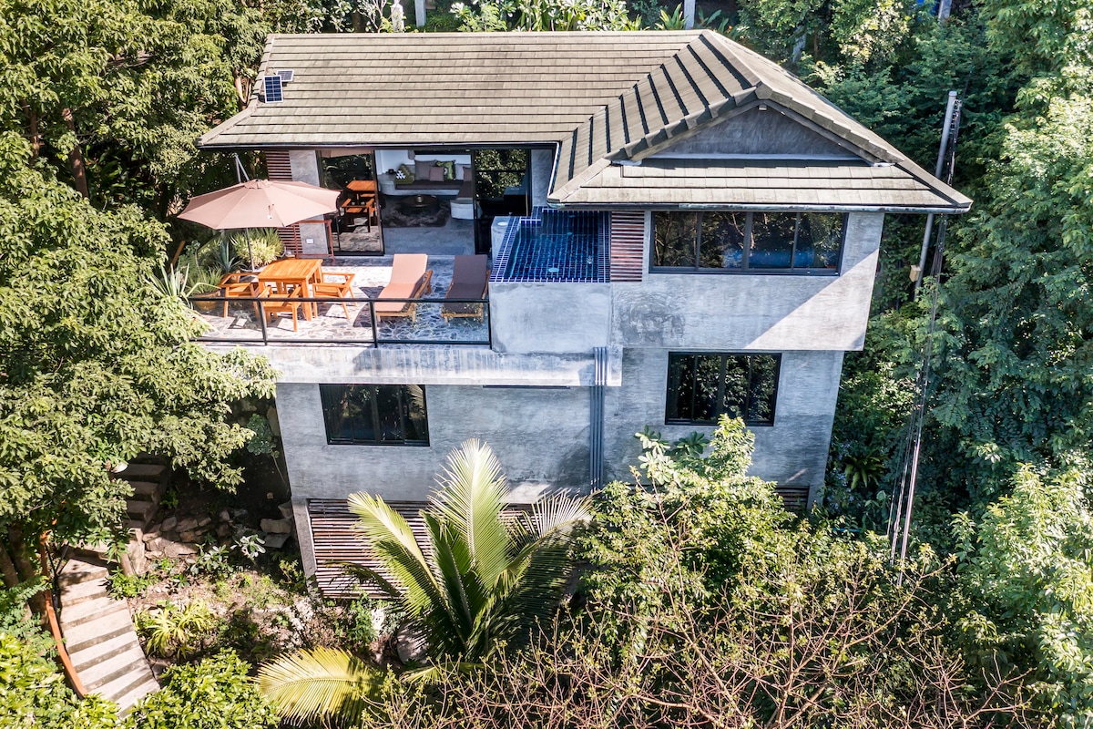Relájate en este espacio tranquilo, privado y con estilo. La sala de estar de planta abierta está decorada con buen gusto con muebles tradicionales tailandeses y cuenta con una cocina totalmente equipada, un cómodo salón y un comedor. Las puertas se abren a una amplia terraza al aire libre, con piscina privada, sala y zona de tumbonas, el lugar perfecto para relajarse. Ubicada en la ladera de las colinas entre la exuberante selva tropical, la casa cuenta con la máxima privacidad, impresionantes puestas de sol y vistas al mar. (No menores de 12 años)
